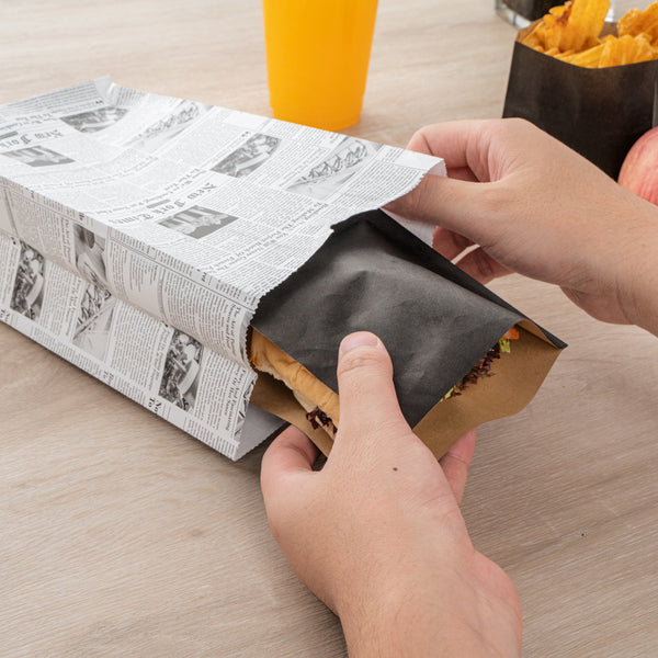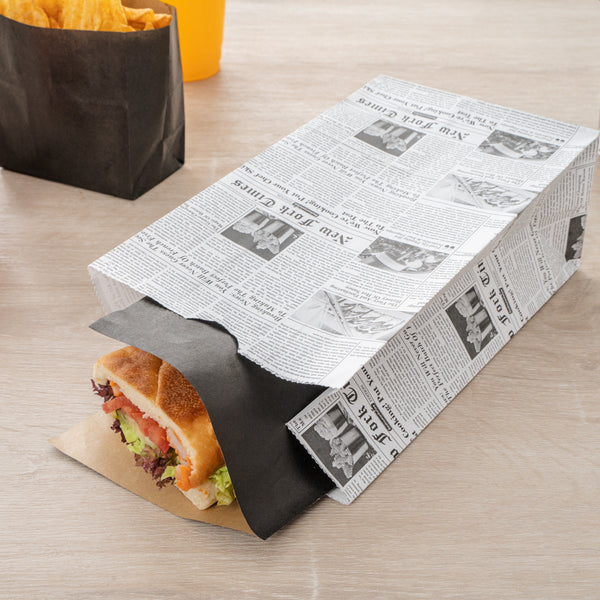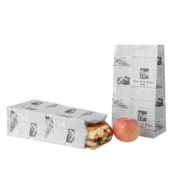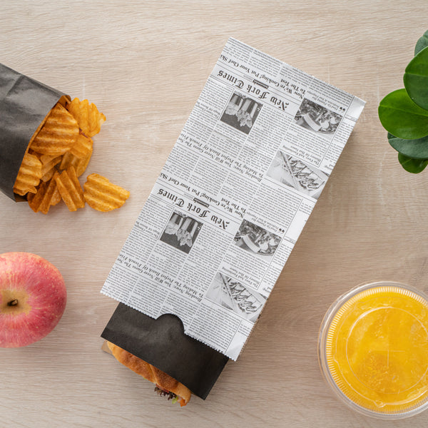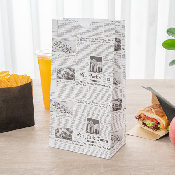 Pack up your snacks and desserts in our Bag Tek Newsprint Paper Bags. Equipped with a flat bottom, these paper food bags can be placed upright on flat surfaces for an easy packaging process at your deli or restaurant. With an open-top design, these retail paper bags can be rolled down to keep food from spilling. Made from premium paper, these newspaper bags are recyclable to reduce your carbon footprint. Featuring a newsprint finish, these paper grocery bags give your take out packaging a chic and stylish look. With a high-quality construction, these paper bags can hold up to 4 pounds of your to-go snacks. These recyclable paper bags measure 5 inches long by 3.25 inches wide by 9.5 inches tall. Sold in a 100 count box.