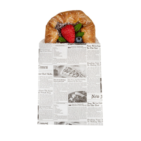 Hand out samples or snacks using our Bag Tek Newsprint Paper Bags. The open-pouch design of these disposable paper bags allows you to make your special treats portable. Crafted from greaseproof paper, these sandwich bags won't create unsightly oily spots to ensure they maintain their premium look. With a newsprint finish, these disposable bags give your take out presentations a touch of style. These paper snack bags are biodegradable and recyclable for a sustainable way to dispose of them after use. These newsprint paper bags measure 7 inches long by 5 inches wide. Sold in a 100 count box. This item will only degrade outside of the traditional solid waste stream.