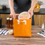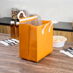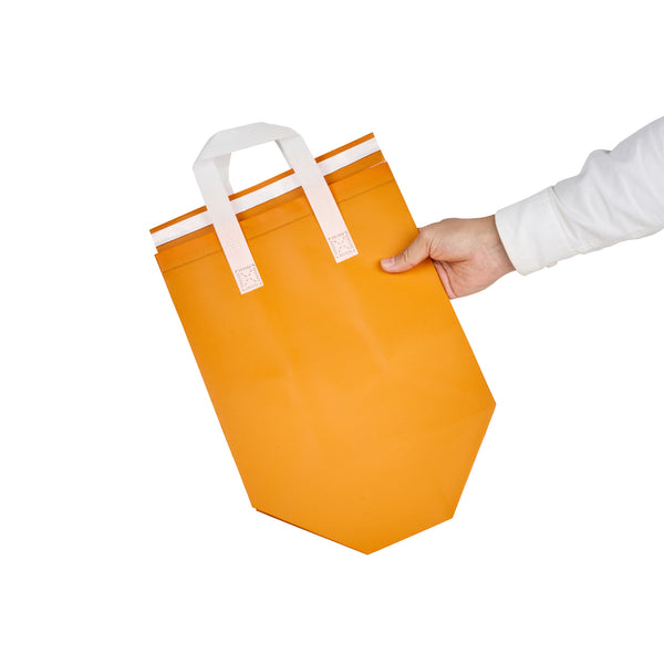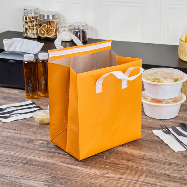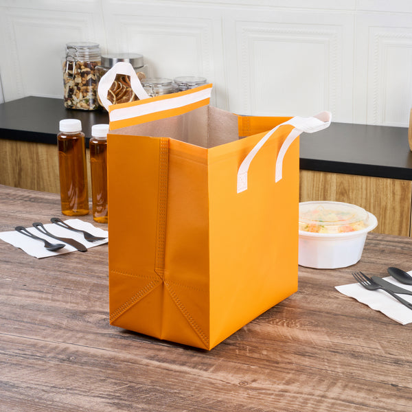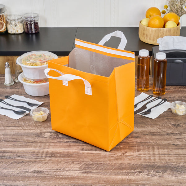 Ensure secure meal deliveries with insulated food delivery bags. Bag Tek Orange Nonwoven Insulated Food Delivery Bags feature advanced insulation technology, maintaining the perfect temperature for both hot and cold foods, making them essential for restaurants and caterers. These thermal grocery bags boast a tamper-evident design, ensuring food safety by alerting staff and customers if the bag has been accessed, which is critical for maintaining trust and hygiene. Their spacious dimensions of 10.25 inches in length, 6.75 inches in width, and 11 inches in height accommodate a variety of food containers, from large entrees to beverages and snacks, offering versatility for different menu items. Crafted from sturdy nonwoven material, these reusable cooler bags are lightweight, foldable, and easy to clean, providing a durable option for repeated use. Sturdy handles ensure easy, stable transport, even with heavy orders. Each order includes 25 Bag Tek Orange Food Delivery Bags.