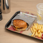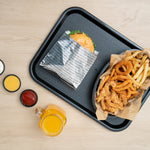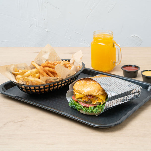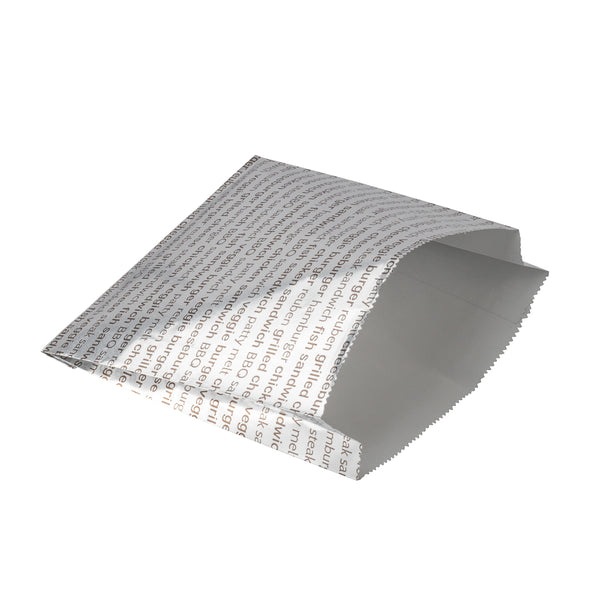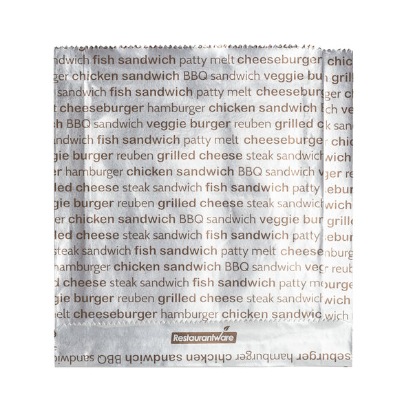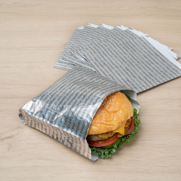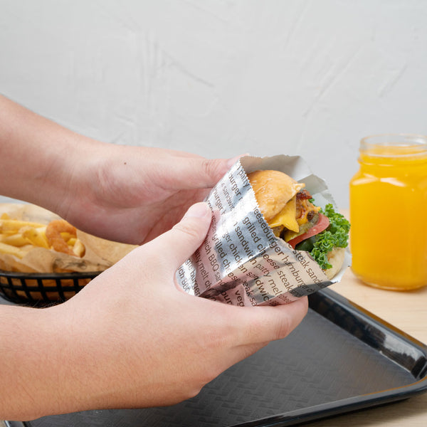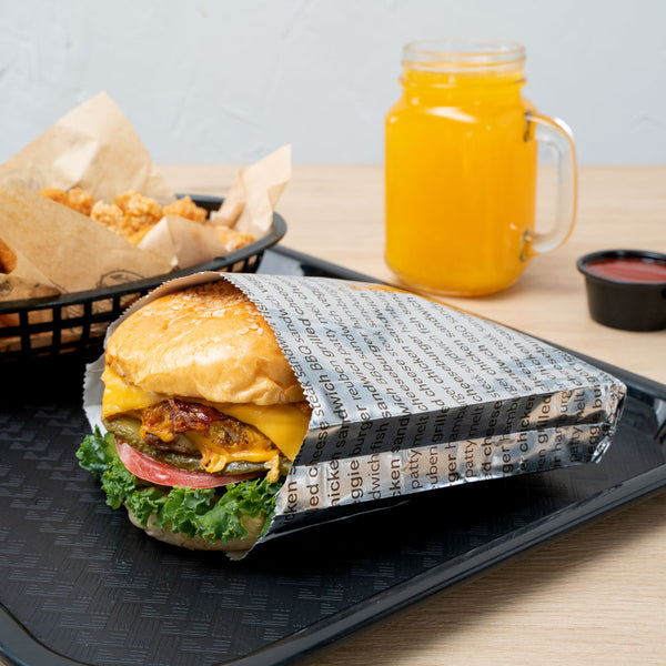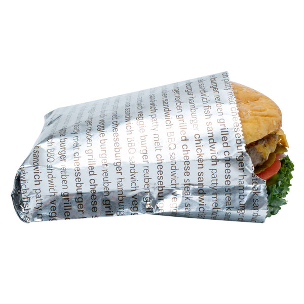 Serve burgers and fries to go using our Bag Tek Paper Printed Burger Foil Bags. These burger bags are made with a non-vented design that allows heat and moisture retention to keep meals warm. Made from high-quality aluminum foil and paper, these deli bags are heat-resistant and freezer-safe to conveniently store all kinds of food items. Featuring a greaseproof lining, these burger bags are perfect for preventing greasy burgers from creating oily stains. The printed design of these deli bags adds a modern touch to take out presentations at your foodservice establishment. These foil sandwich bags are designed with ample room to securely contain burgers, wings, or sandwiches. Each deli bag measures 5.9 inches in length by 1.2 inches in width and 6.5 inches in height. Shipped in a 100 count box.