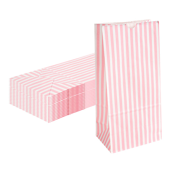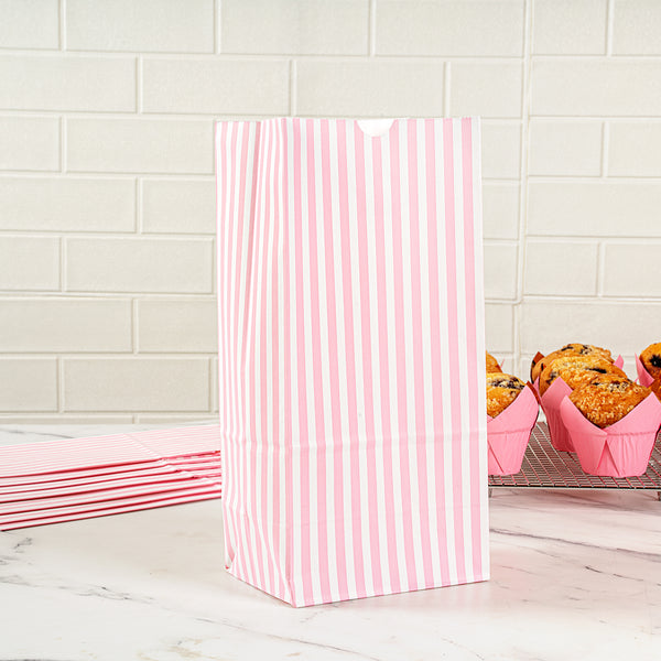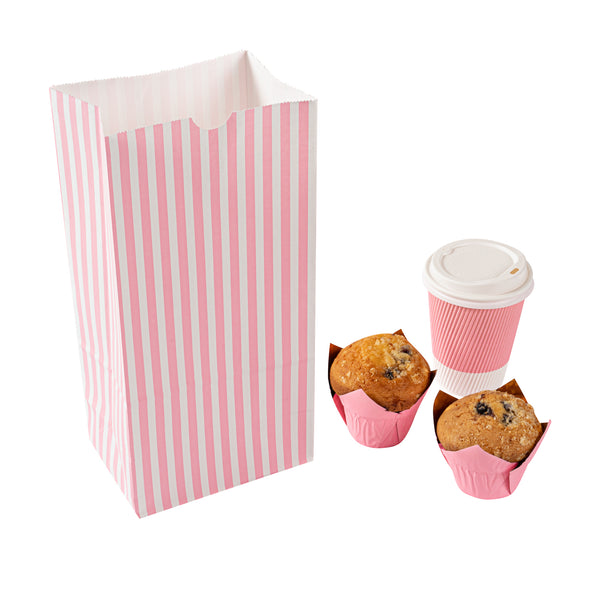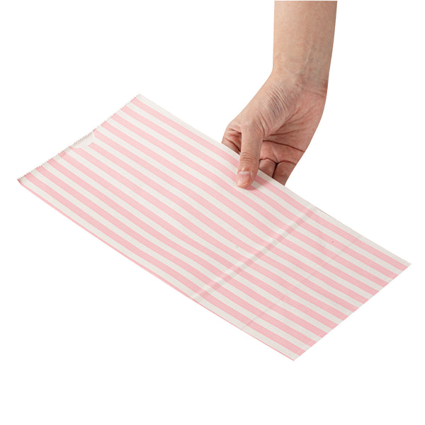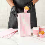 Deliver your takeaway orders using our Bag Tek Pink and White Stripe Paper Bags. These disposable lunch bags can securely hold up to 8 pounds of selected treats and are made from sturdy paper for reliable use and easy disposal. Crafted from high-quality paper, these merchandise bags are durable with a grease-resistant coating to prevent oily spills and messes. The open-top design of these take out bags provides straightforward filling and can be securely folded down for tidy carry-out service. To easily store your leftovers, these disposable paper bags are freezer-safe. The flat bottom design enables these paper deli bags to stand upright, facilitating easy packing. The pink and white stripes of these popcorn bags elegantly match your takeout collection. Each striped take out bag has a capacity of 8 pounds and measures 6 inches in length by 4. inches in width by 11.75 inches in height. Shipped in a 100 count box.