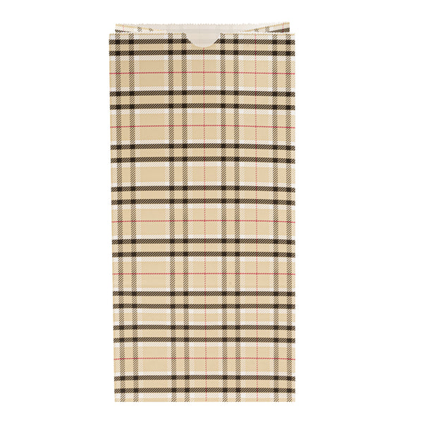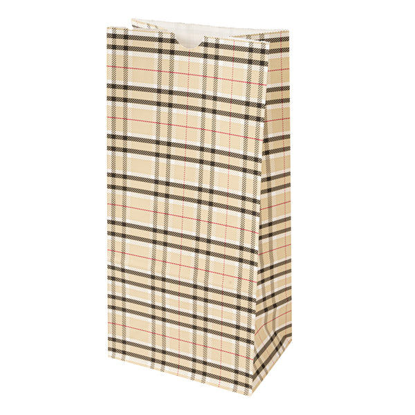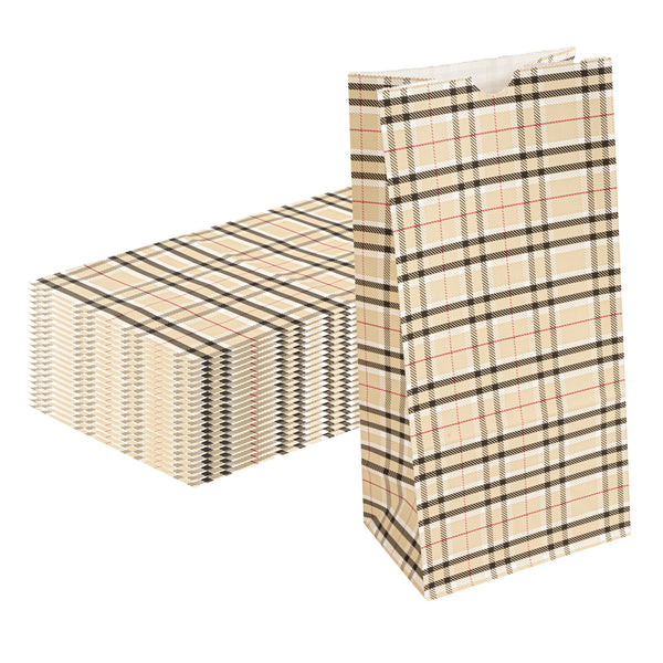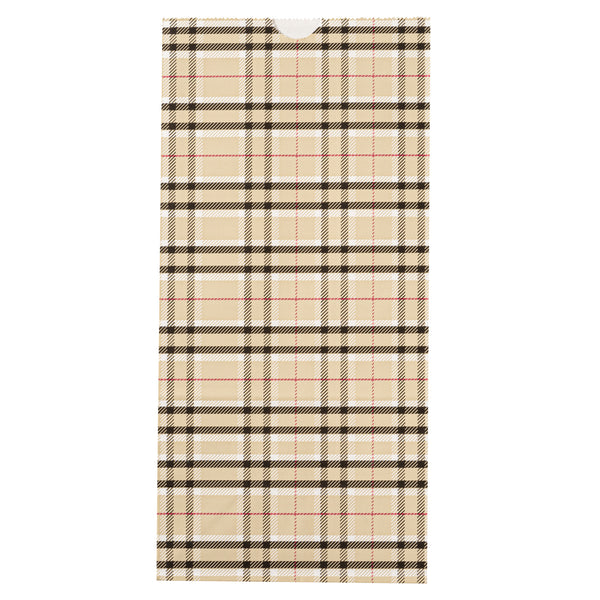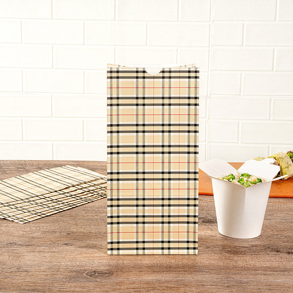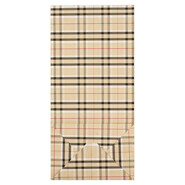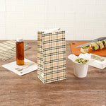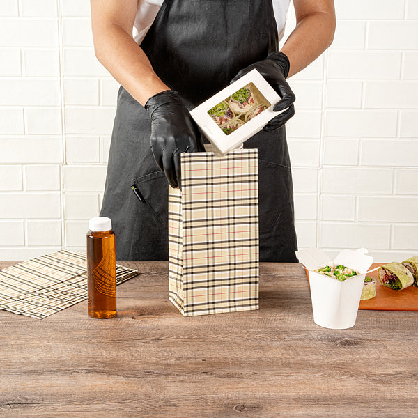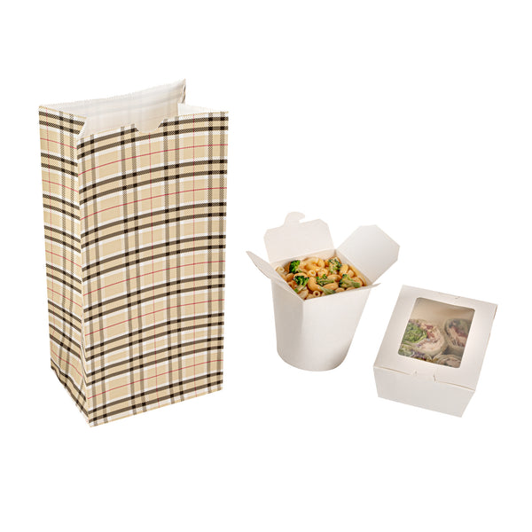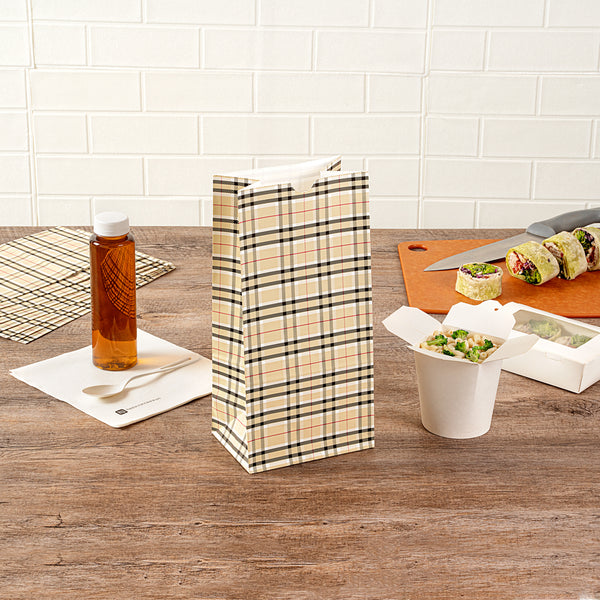 Enhance your takeaway experience with our Bag Tek Plaid Paper Bags. These disposable lunch bags can safely carry up to 8 pounds of meals and snacks and are composed of high-quality paper for easy disposal. Crafted from high-quality paper, these disposable deli bags are durable with a grease-resistant coating to keep away oily mess. The open-top design of these paper deli bags simplifies access and allows for clean folding, making food portability a breeze. To easily store your leftovers, these disposable paper bags are freezer-safe. These paper take out bags are disposable for quick cleanup. Designed with a flat bottom, these paper deli bags ensure upright stability for easier packing. The distinct plaid pattern of these popcorn bags adds a stylish touch to your other take out supplies. Each take out bag has a capacity of 8 pounds and measures 6 inches in length by 4. inches in width by 11.75 inches in height. Shipped in a 100 count box.