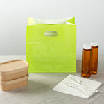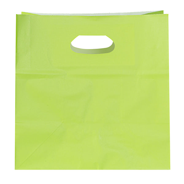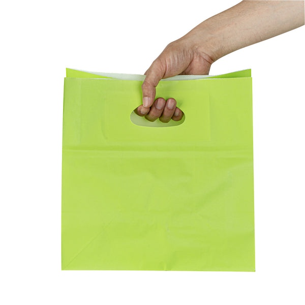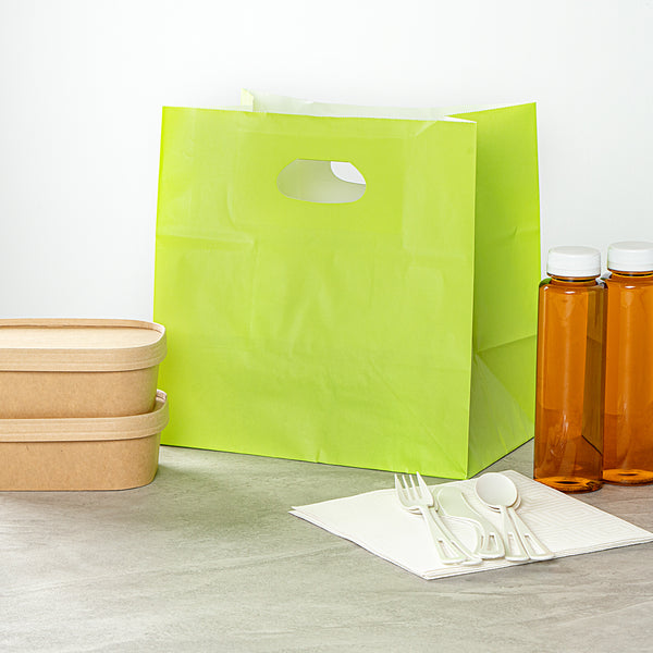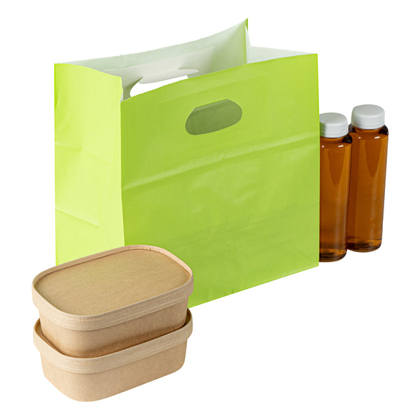 Pack up your takeout orders effortlessly with our Bag Tek Rectangle Eco Green Paper Take Out Bags. Built from premium paper paper, these carry out bags are disposable and biodegradable, facilitating eco-conscious cleanup. These paper shopping bags feature practical cut-out handles that allow for the comfortable transport of several food items. The robust rectangular base of these take out bags ensures secure support for weighty meals, averting spills or accidents. Featuring a stand-open design, these green take out bags simplify your employees' packing processes. These gift bags have an appealing green finish that enhances your takeout supplies with a trendy touch. Each paper take out bag measures 11 inches in length by 7 inches in width by 11 inches in height. Sold in a 100 count box. These items will only degrade outside of the traditional solid waste stream.