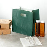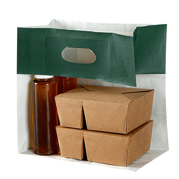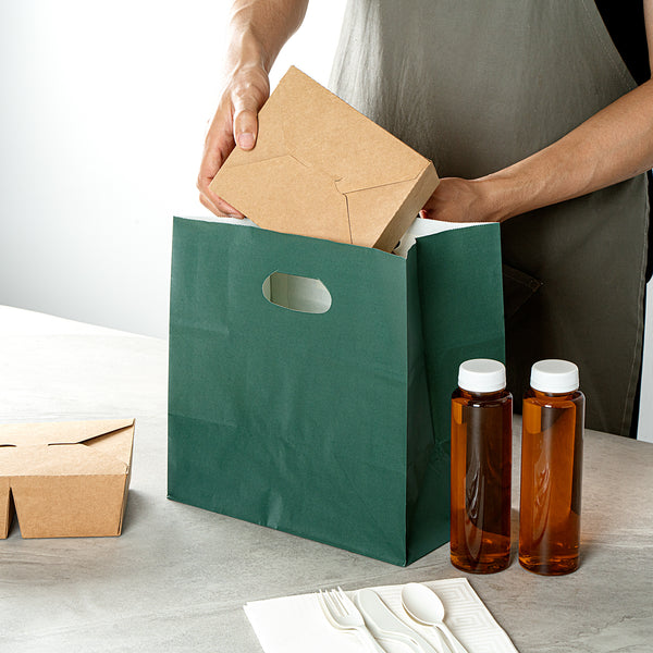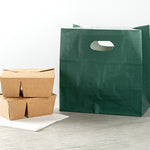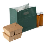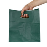 Conveniently handle large to-go orders with our Bag Tek Rectangle Forest Green Paper Take Out Bags. Constructed from high-quality paper, these gift bags are biodegradable and disposable, promoting an eco-friendly cleanup solution. These paper take out bags have comfortable cut-out handles making carrying several items a breeze. The sturdy rectangular base of these paper shopping bags provides ample support for heavy meals, preventing spills or mishaps. For efficient packing, these take out bags boast a stand-open design. The striking forest green finish of these carry out bags adds a touch of stylish charm to your establishments takeout supplies. Each forest green bag measures 11 inches in length by 7 inches in width by 11 inches in height. Sold in a 100 count box. These items will only degrade outside of the traditional solid waste stream.