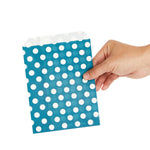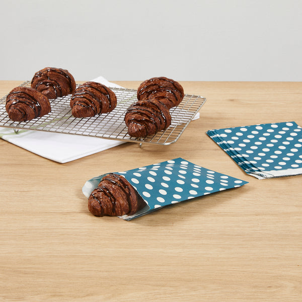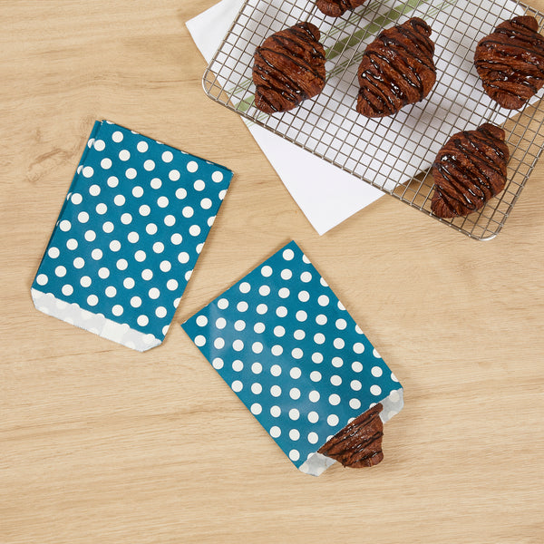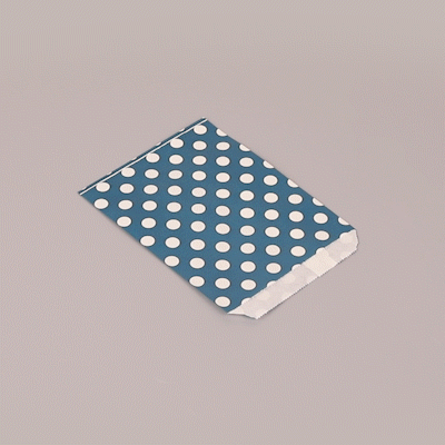 Pack your delicious treats for take out services by using our Bag Tek Rectangle Navy Blue Paper Bags. A must-have for bakeries and cafes, these trendy paper bags feature a navy blue finish with white polka dots that makes your sweet treats even sweeter. Made from recyclable paper, these stylish paper bags are a sustainable option for packing your delectables. These printed paper pouches are strong enough to hold a variety of dry foods, and baked goods without rupturing. The high-quality construction of these bakery packaging bags is designed to keep food fresh and crisp by not letting oils and grease from leaking through. Easy to customize, you can just seal the open end of these trendy pouches with a personalized sticker. The printed bakery pouches have a sealed bottom that makes it simple to hold them while enjoying the treats. Conveniently disposable, these paper bakery pouches make the cleaning process easy. With each paper pouch measuring 7 inches in length and 5 inches in width, you can serve candies, cookies, donuts, or fudges without any hassle. Sold in a 100 count box.