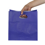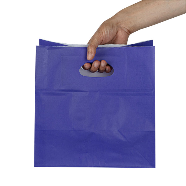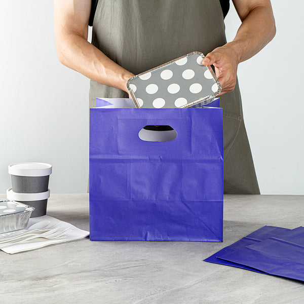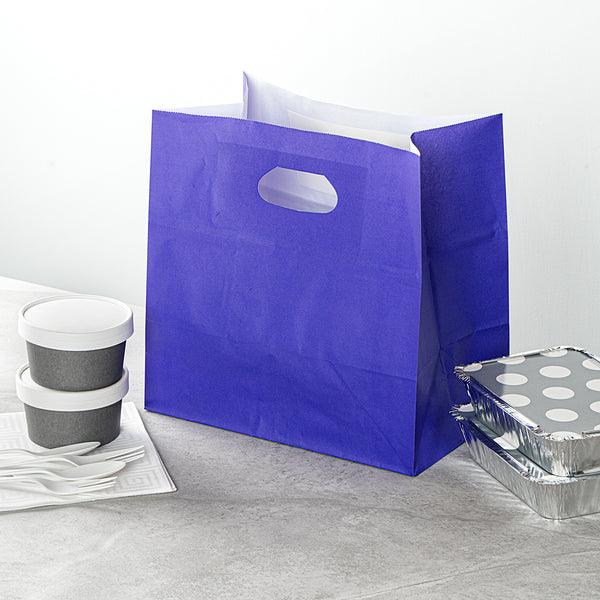 Simplify large to-go orders using our Bag Tek Rectangle Purple Paper Take Out Bags. Constructed from high-quality paper, these gift bags are disposable and biodegradable for an easy, eco-friendly cleanup post-use. These paper take out bags feature cut-out handles to ensure a comfortable carry of several food items. The strong rectangular base of these paper shopping bags can hold heavy meals without the risk of spills or accidents. These take out bags have a stand-open design that allows easy filling and packing. The attractive purple finish of these carry out bags introduces a vibrant touch to your establishments takeout setup. Each purple take out bag measures 11 inches in length by 7 inches in width by 11 inches in height. Sold in a 100 count box. These items will only degrade outside of the traditional solid waste stream.