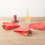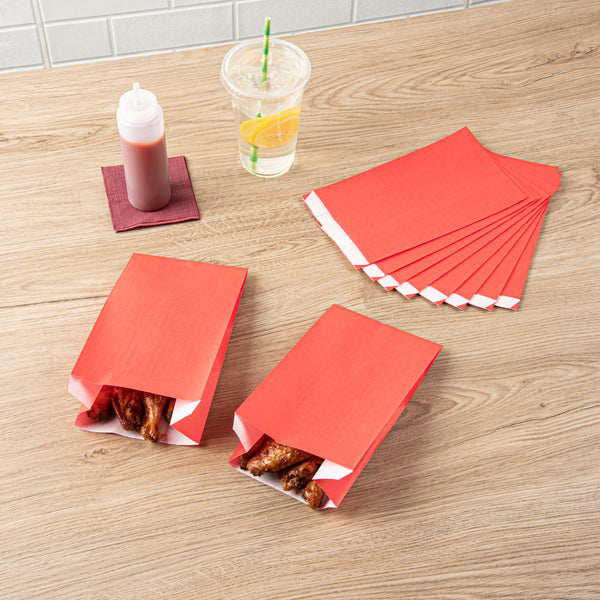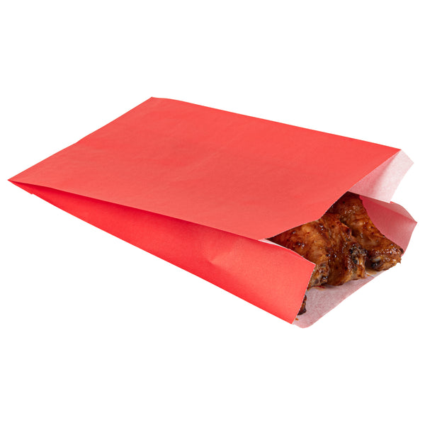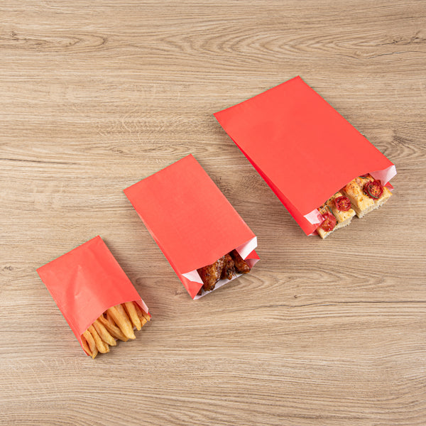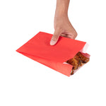 Exemplify vibrant snack service with our Bag Tek Red Paper French Fry / Snack Bags. These goodie bags feature an open-pouch design, expediting the packaging process and providing customers with effortless access to their appetizers. To eliminate oil seepage, these snack bags are greaseproof ensuring mess-free eating. With an extended lip design, these disposable snack bags can be easily opened up without any hassle to streamline your service. The bright red finish of these French fry bags integrates a punchy element into your food presentation while blending effortlessly with your tableware. For an effortless cleaning experience, these treat bags are disposable. These red snack bags measure 5 inches in length by 3 inches in width by 8.75 inches in height. Sold in 100 count box.