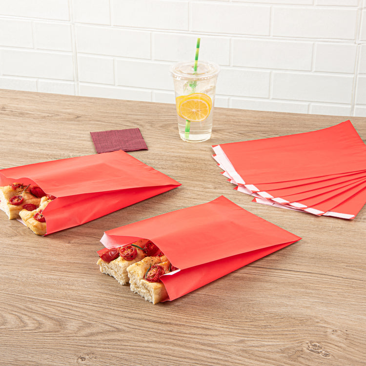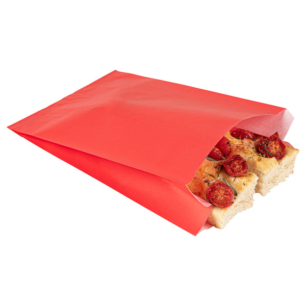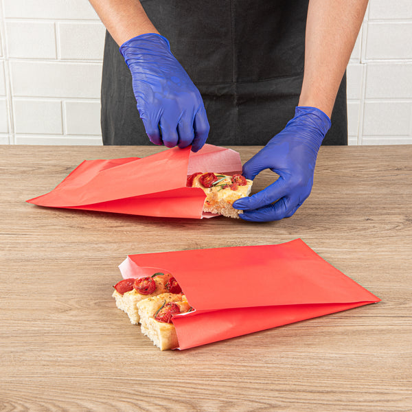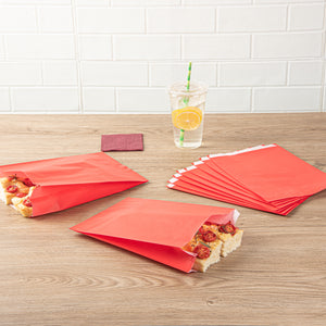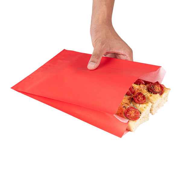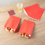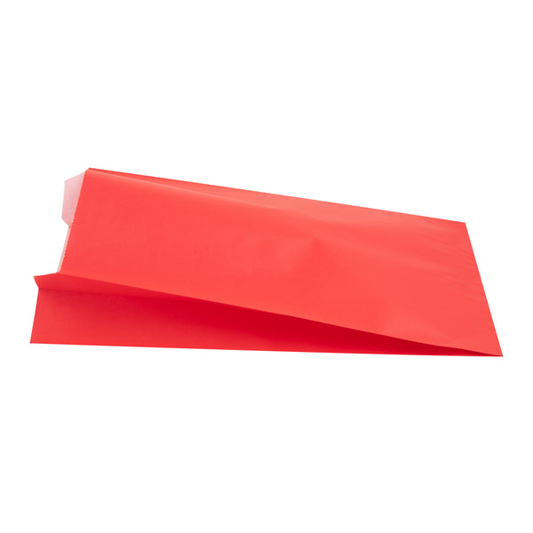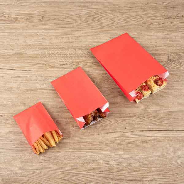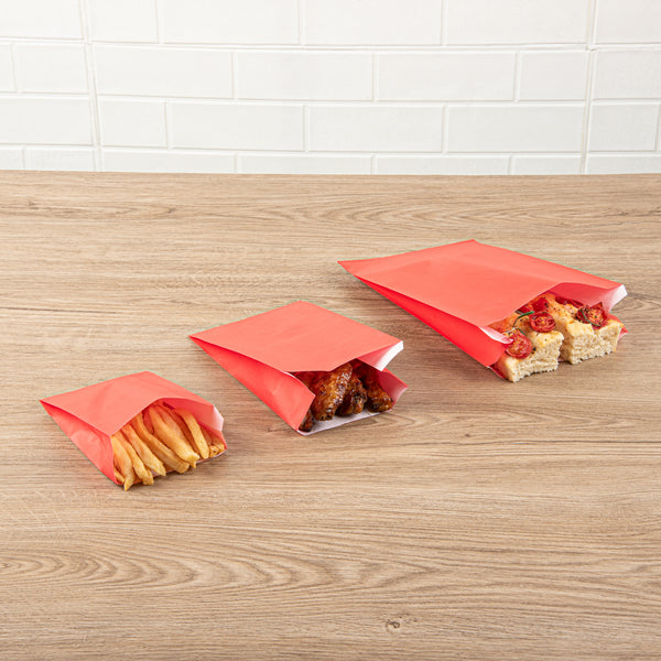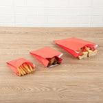 Serve your customers' snacks with our Bag Tek Red Paper French Fry / Snack Bags. With an open-pouch design, these French fry bags make it easy for customers to take your finger foods on the go. These snack bags are greaseproof, making them perfect for holding fried onion rings or crispy fries as they eliminate unsightly grease stains. The extended upper lip of these paper food bags makes fast separations easy, improving the service speed. To facilitate a quick and easy cleanup, these treat bags are disposable. The vibrant red finish of these goodie bags adds a splash of color to the look of meals, making them visually appealing. These sandwich bags measure 7 inches in length by 3 inches in width by 11 inches in height. Sold in a 100 count box.