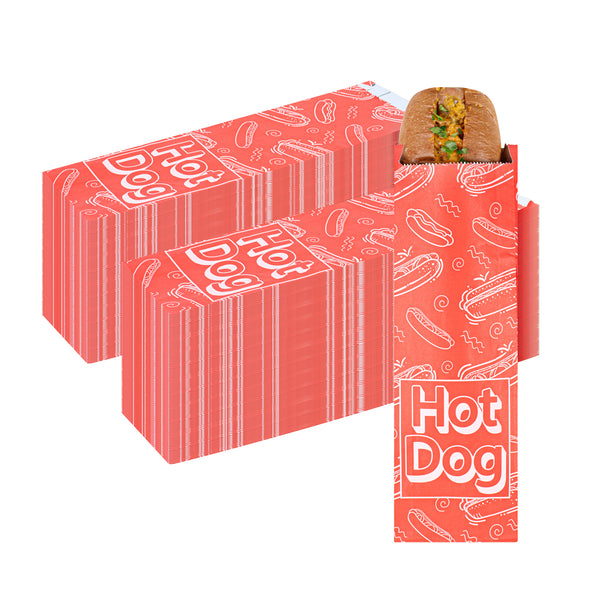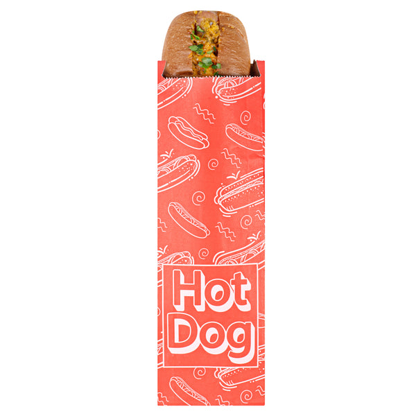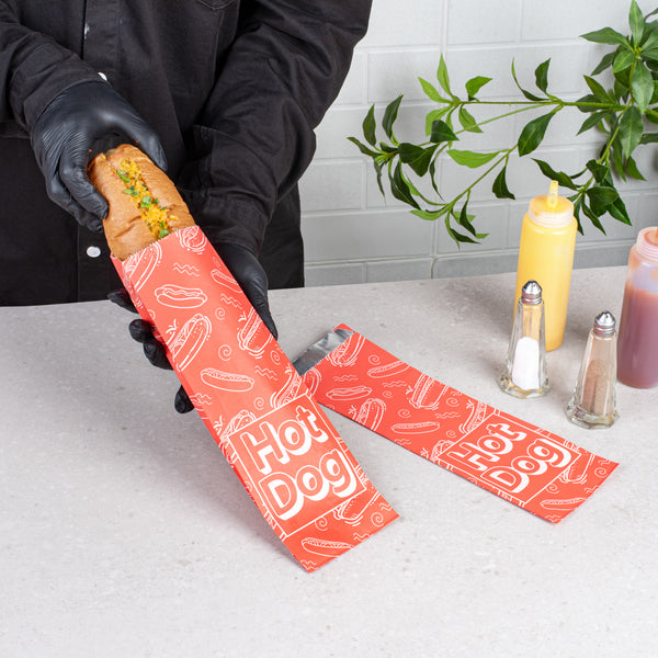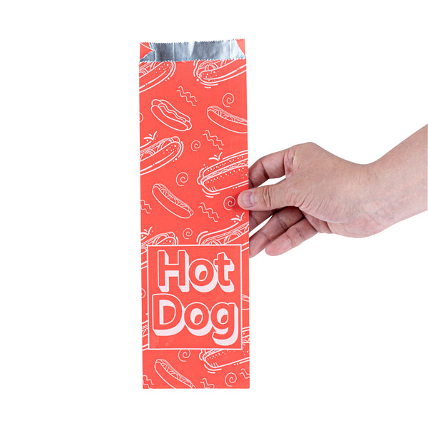 Pack your signature hoagie roll with our Bag Tek Red Paper Printed Large Hot Dog Foil Bags. The interior of these food packaging bags is lined with aluminum foil for excellent heat retention, keeping your food warm and delicious. These foil bags are greaseproof and prevent oil or sauces from seeping through, ideal for maintaining a clean presentation. With a non-vented design, these take out bags ensure moisture retention to keep meals juicy and flavorful. Featuring a unique hot dog print on a red finish, these hot food bags add a vibrant touch to all your to go orders. The printed "Hot Dog" message on these disposable take out bags enhances your food presentation, making them stand out. The exterior of these hot dog bags is crafted from premium paper, which is durable and suitable for securely packing your culinary creations. These foil pouches are freezer-safe and allow you to refrigerate your leftovers for later enjoyment. Ideal for an easy post-meal cleanup, these disposable food bags can be discarded after use. These hot dog wrappers measure 3.74 inches in length by 1.18 inches in width by 12.01 inches in height. Sold in a 100 count box.