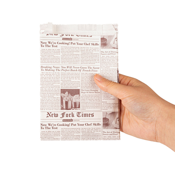Easily pack up snacks using our Bag Tek Sepia Newsprint Paper French Fry / Snack Bags. Made of high-quality kraft paper, these sturdy kraft paper snack bags are greaseproof, preventing oils and sauces from seeping out. These disposable snack pouches are recyclable, reducing your food establishment's carbon footprint. With side gussets, these sandwich bags have a wide opening to fill food quickly. Featuring a newsprint finish with brown font, these pretzel bags provide a vintage aura to your bakery, restaurant, or concession stand. These small treat bags measure 4.25 inches in length by 1.5 inches in width by 6.25 inches in height. Shipped in a 100 count box.