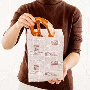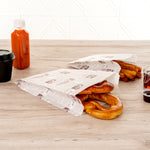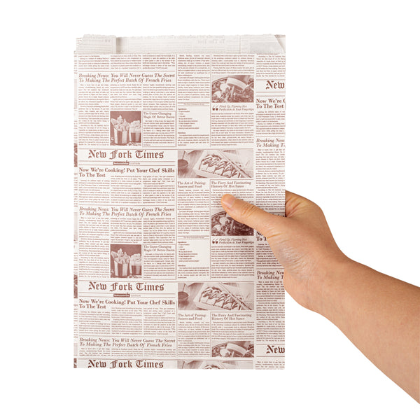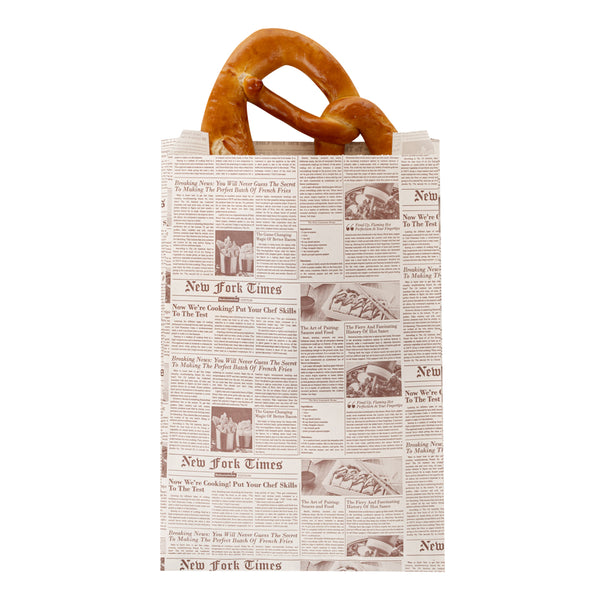 Allow guests to comfortably take mouthwatering appetizers on the go with our Bag Tek Sepia Newsprint Paper French Fry / Snack Bags. Constructed from high-quality kraft paper, these party treat bags are tear-resistant, making them sturdy and durable. With a greaseproof silicone oil coating, these french fry bags prevent oils from seeping through. These snack pouches have a pinch bottom to give them additional strength to hold heavy foods. Designed with side gussets, these food bags provide easy access to the food inside. These kraft paper snack bags are recyclable and commercially compostable, making them an eco-friendly alternative to plastic bags. These bags are freezable. These pretzel bags have a newsprint finish with brown font, providing an elegant appeal to your bakery, restaurant, or concession stand take outs. These cookie bags measure 7 inches in length by 3 inches in width by 11 inches in height. Shipped in a 100 count box.