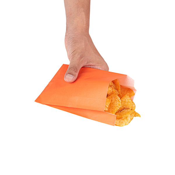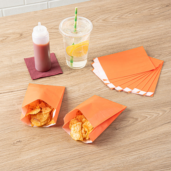 Brighten up your snack presentation with our Bag Tek Tangerine Orange Paper French Fry / Snack Bags. Crafted from high-quality paper, these treat bags are greaseproof, keeping oil and grease-related messes at bay. The open-pouch design of these snack bags allows patrons to easily access and relish their tasty treats. These French fry bags have an extended lip that facilitates your staff to quickly pack snacks for smooth service. These orange paper bags are disposable for a seamless cleaning experience. The vivid orange finish of these goodie bags complements your take out supplies wonderfully. Each orange snack bag measures 4.25 inches in length by 1.5 inches in width by 6.25 inches in height. Sold in a 100 count box.