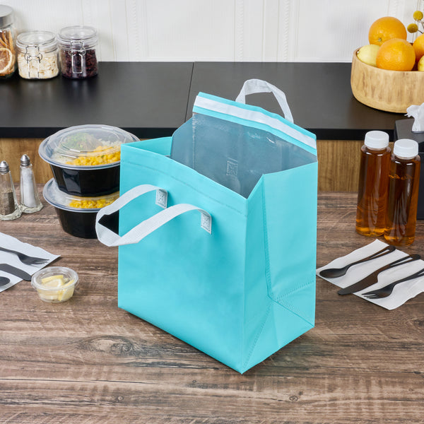 Ensure food safety and maintain the perfect temperature with ease. Bag Tek Nonwoven Insulated Catering Bags boast a tamper-evident design that clearly indicates if the bag has been opened, promoting trust and food safety for your delivery services. Constructed with advanced insulation technology, these insulated catering bags keep hot foods hot and cold foods cold for hours, making them ideal for catering events and bustling takeout operations. With a spacious design measuring 10.25 inches long by 6.7 inches wide by 11 inches high, these thermal delivery bags accommodate multiple food containers and beverages, ensuring versatility across menu offerings. Crafted from nonwoven material, they feature sturdy handles for easy and stable carrying, perfect for reliable transport. Enhance your brand's presentation with their attractive teal color while providing secure and insulated packaging. Each order includes 100 Bag Tek Nonwoven Insulated Catering Bags.