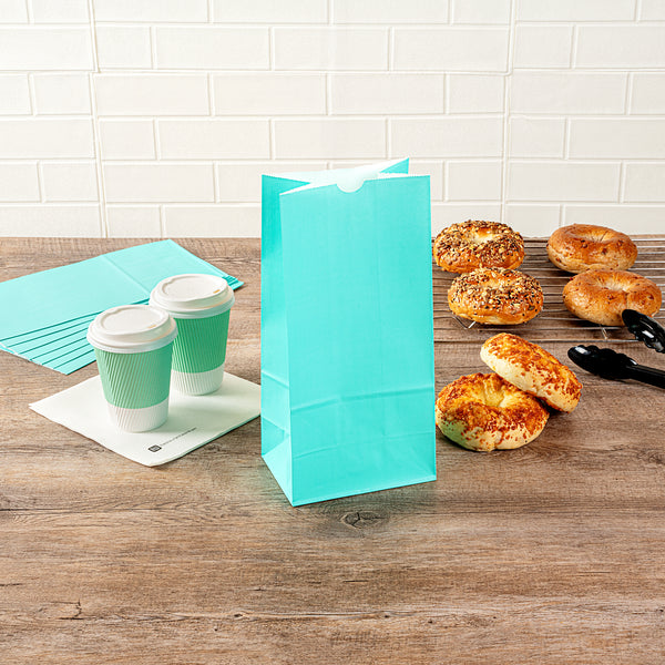 Maintain pristine presentation with grease-resistant bakery bags. Bag Tek Grease-Resistant Bakery Bags feature a robust paper construction that ensures reliability for carrying baked goods and takeout meals, enhancing the operational efficiency of foodservice establishments. These takeout paper bags boast a vibrant turquoise color that draws customer attention, elevating your brand's presentation and appeal. With an 8-pound capacity and dimensions of 6 inches by 4 inches by 11.8 inches, these bags provide ample space for packaging a variety of items without being cumbersome. The flat bottom design offers upright stability, making it perfect for secure packaging of snacks and pastries. The open-top design also allows for easy access, ensuring customers can conveniently enjoy their meals. Ideal for bakeries and cafes, these grease-resistant bags prevent unsightly oil splotches, maintaining a clean and professional look for your business. Each order includes 100 Bag Tek Grease-Resistant Bakery Bags.