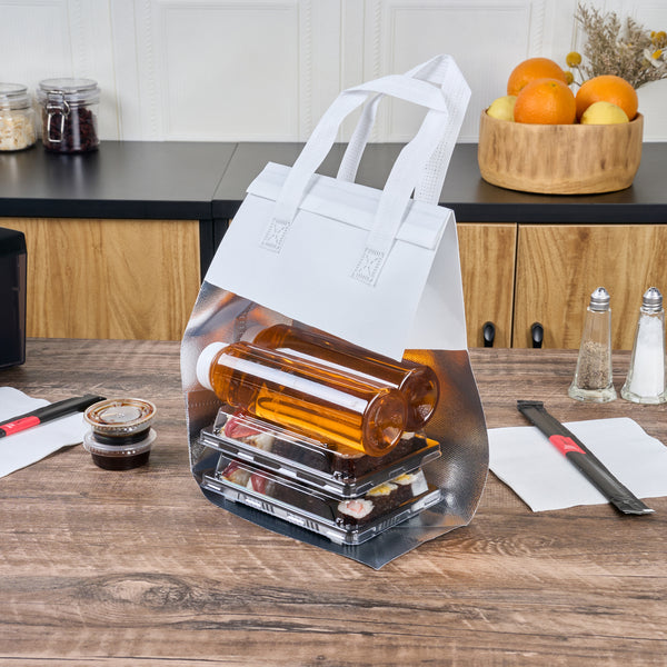 Ensure food arrives fresh with insulated meal delivery bags. Bag Tek Insulated Thermal Delivery Bags feature advanced insulation technology that maintains food temperatures for hours, guaranteeing that your delivery service offers meals at optimal quality. The spacious design of these cooler grocery bags accommodates meals, snacks, and beverages, measuring 8.25 inches in length by 4.25 inches in width by 10.75 inches in height, making them perfect for versatile menu items. Made from recyclable paper, these bags also support sustainability initiatives while ensuring durability. Sturdy handles provide stability, making it easy to carry even heavy takeout orders without risk of tearing. The tamper-evident design adds an extra layer of security, ensuring customers receive their orders as intended. Upgrade your takeout and delivery operations with these dependable thermal delivery bags. Each order includes 100 Bag Tek Insulated Thermal Delivery Bags.