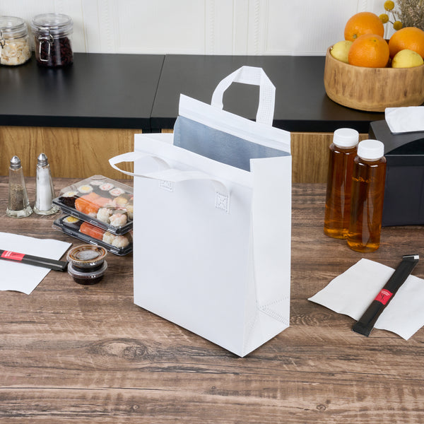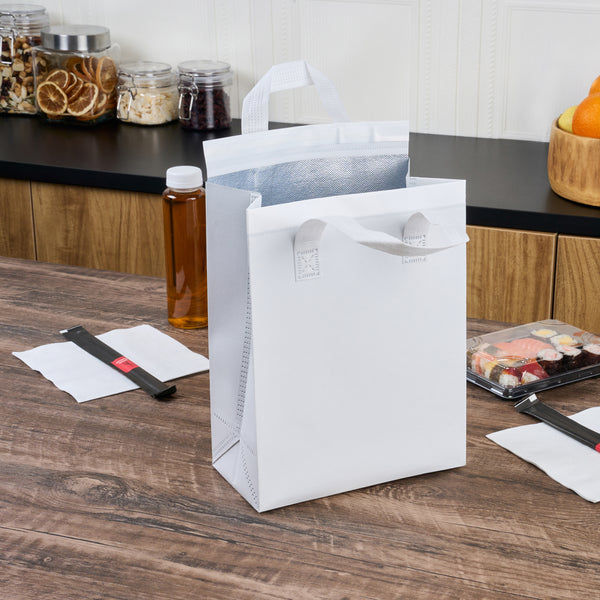 Ensure food arrives fresh with insulated meal delivery bags. Bag Tek Insulated Thermal Delivery Bags feature advanced insulation technology that maintains food temperatures for hours, guaranteeing that your delivery service offers meals at optimal quality. The spacious design of these cooler grocery bags accommodates meals, snacks, and beverages, measuring 8.25 inches in length by 4.25 inches in width by 10.75 inches in height, making them perfect for versatile menu items. Made from recyclable paper, these bags also support sustainability initiatives while ensuring durability. Sturdy handles provide stability, making it easy to carry even heavy takeout orders without risk of tearing. The tamper-evident design adds an extra layer of security, ensuring customers receive their orders as intended. Upgrade your takeout and delivery operations with these dependable thermal delivery bags. Each order includes 25 Bag Tek Insulated Thermal Delivery Bags.