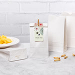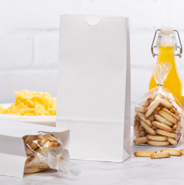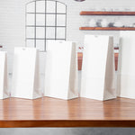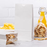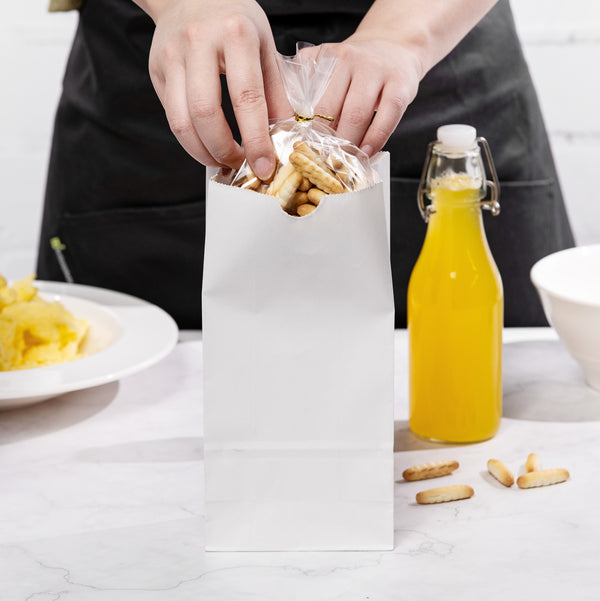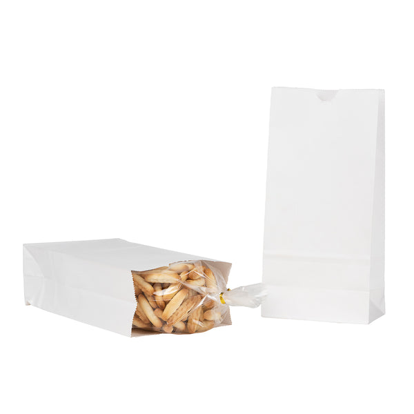 Our Bag Tek White Paper Bags make it easy to take pastries home with you. Designed with flat bottoms, these kraft paper bags stand up by themselves on tabletops so you can comfortably package food. Featuring an open top, these merchandise bags can be rolled down to securely contain sandwiches during deliveries. Made from premium paper, these retail bags are tear-resistant to prevent any spills while on the go. The classic white finish of these paper lunch bags gives your presentations a traditional and versatile look. These recyclable paper bags are 4.33 inches long by 2.36 inches wide by 8.66 inches long and contain up 2 pounds of small pies. Sold in a 100 count box.