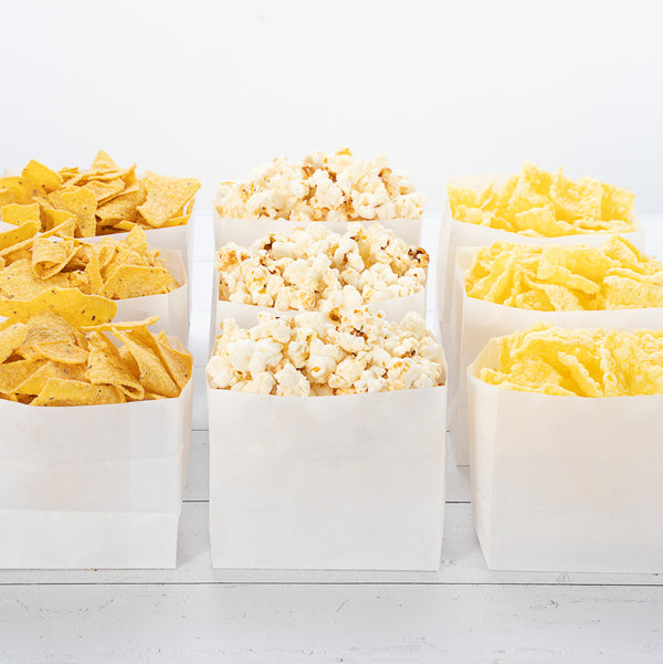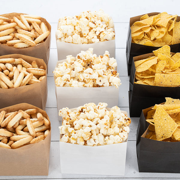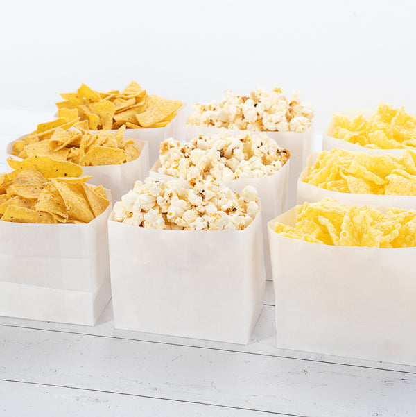 Enhance your snack service with these bags designed for perfection. The Bag Tek White Paper Large Snack Bag offers a clean presentation with its white paper construction, perfect for serving popcorn or pretzels. The recyclable design of these bags supports eco-friendly foodservice operations, aligning with sustainability goals without compromising on performance. Elevate your food packaging with the reliable and efficient features of these snack bags, which are indispensable for any high-volume foodservice operation. The compact 4.25 inches by 2.5 inches by 3.75 inches dimensions are perfect for small items, making these mini snack bags ideal for concession food settings or as small paper food bags for sandwiches and pastries. Sold in a 100 count box.