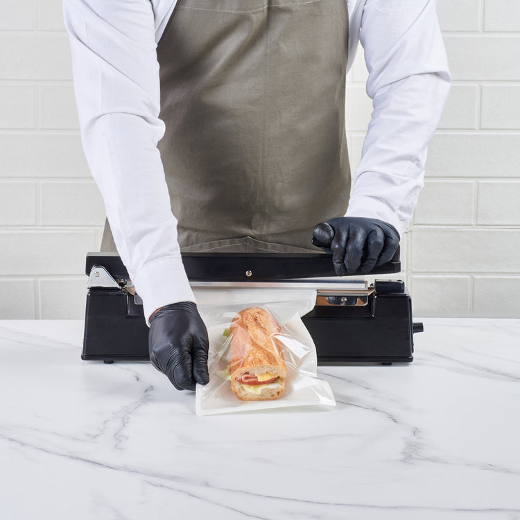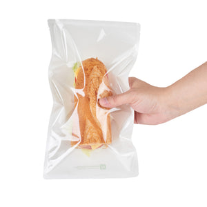 Conveniently pack and store a variety of treats with our Bag Tek White Plastic Large Sandwich and Snack Bags. Constructed with durable and lightweight material, these snack storage bags hold hefty foods, making them ideal for takeaway orders. These sandwich bags offer airtight packaging to preserve the freshness and crispness of snacks and can be heat-sealed. With a clear window to view the contents of the package, these snack bags are great for homemade cookies, candy, cakes, chocolate, snacks, or donuts. Made with a greaseproof material, these sandwich bags keep the oils inside while retaining the taste and aroma of the foods. With an elegant white finish, these heat-seal bags can blend in with any event theme. These bakery candy bags are disposable for an easy cleaning process. Each snack bag measures 11.5 inches in length by 6.75 inches in width. Sold in a 100 count box.
