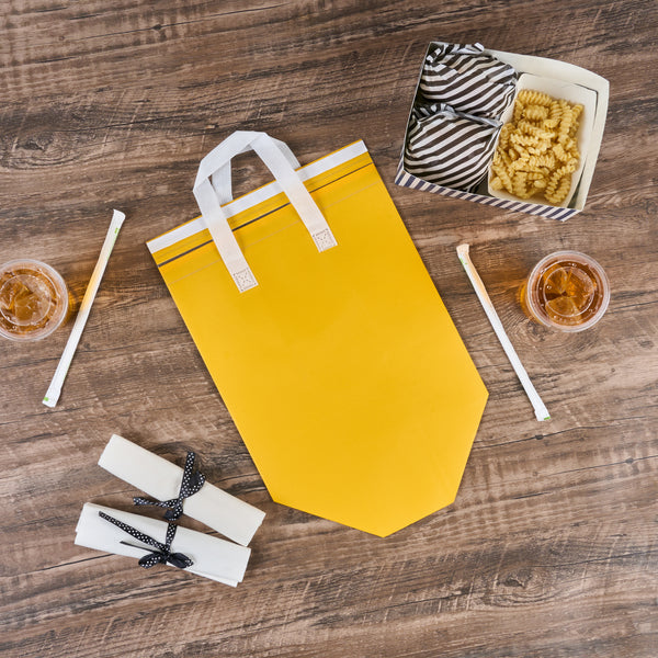 Ensure secure meal deliveries with Bag Tek Insulated Thermal Delivery Bags. These spacious thermal delivery bags offer an insulated interior that maintains food temperature during transport, ensuring hot dishes remain at their ideal warmth while cold items stay refreshingly cool. With a tamper-evident design, these hot food delivery bags provide clear indications if tampered with, enhancing food safety and integrity during delivery services. Constructed from insulated plastic, these reusable food transport bags are engineered with durable materials to support heavy loads without tearing, making them perfect for catering events and takeout orders. Featuring sturdy handles, these bags facilitate easy transport of meals, ensuring comfort and stability for delivery personnel. Measuring 11.8 inches in length the bright yellow color enhances visibility and brand recognition, making your deliveries stand out. Each order includes 100 Bag Tek Insulated Thermal Delivery Bags.