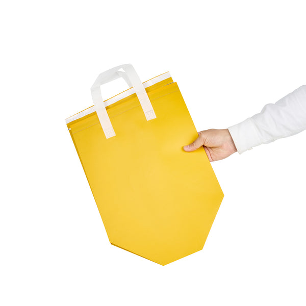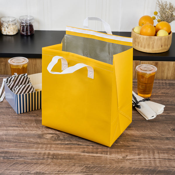 Ensure secure meal deliveries with Bag Tek Insulated Thermal Delivery Bags. These spacious thermal delivery bags offer an insulated interior that maintains food temperature during transport, ensuring hot dishes remain at their ideal warmth while cold items stay refreshingly cool. With a tamper-evident design, these hot food delivery bags provide clear indications if tampered with, enhancing food safety and integrity during delivery services. Constructed from insulated plastic, these reusable food transport bags are engineered with durable materials to support heavy loads without tearing, making them perfect for catering events and takeout orders. Featuring sturdy handles, these bags facilitate easy transport of meals, ensuring comfort and stability for delivery personnel. Measuring 11.8 inches in length the bright yellow color enhances visibility and brand recognition, making your deliveries stand out. Each order includes 25 Bag Tek Insulated Thermal Delivery Bags.