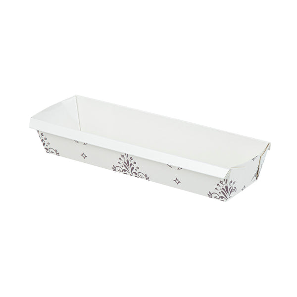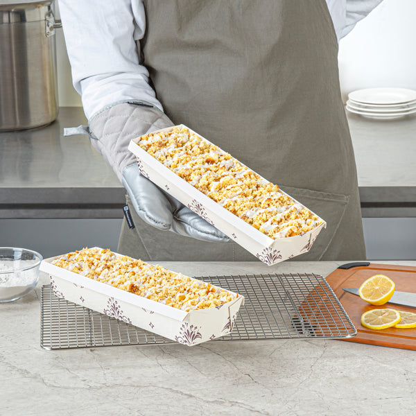 Elevate your baking service with stylish presentation. The Bake Tek Paper Loaf Pan combines a greaseproof paper construction with an elegant vintage floral design, making it an ideal choice for artisanal bakeries and upscale events. Featuring a 32-ounce capacity, this paper loaf pan accommodates medium-sized loaves, perfect for a variety of recipes. Its oven-safe design withstands baking temperatures up to 390 degrees Fahrenheit, ensuring consistent performance without warping, while the greaseproof surface enhances the presentation of quick breads and cakes. Additionally, this rectangular paper loaf pan is freezer safe, allowing for convenient pre-prep and storage, aligning with efficient foodservice operations. The disposable bread pan is eco-friendly, making it easy to serve and dispose of, catering to sustainable practices. Enhance your bakery's efficiency and aesthetic appeal with this essential bakeware solution. Each order includes 100 Bake Tek Paper Loaf Pans.