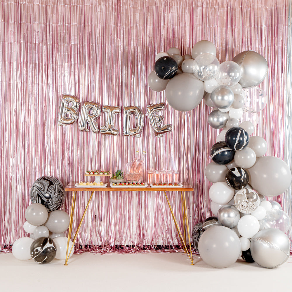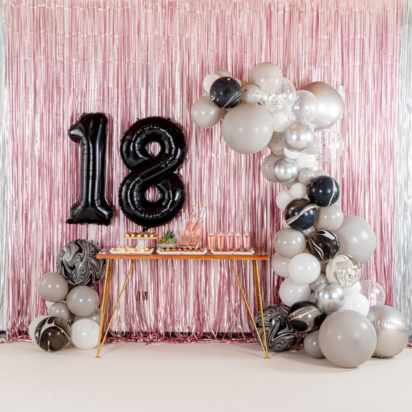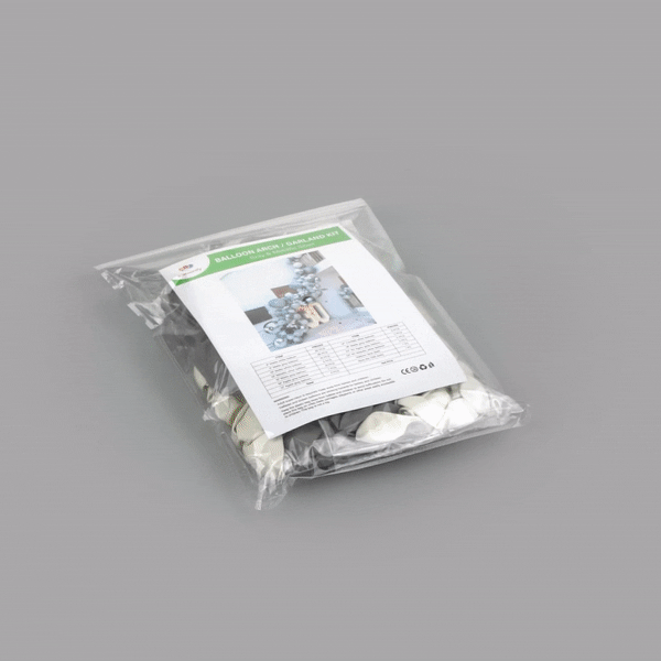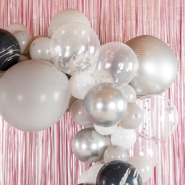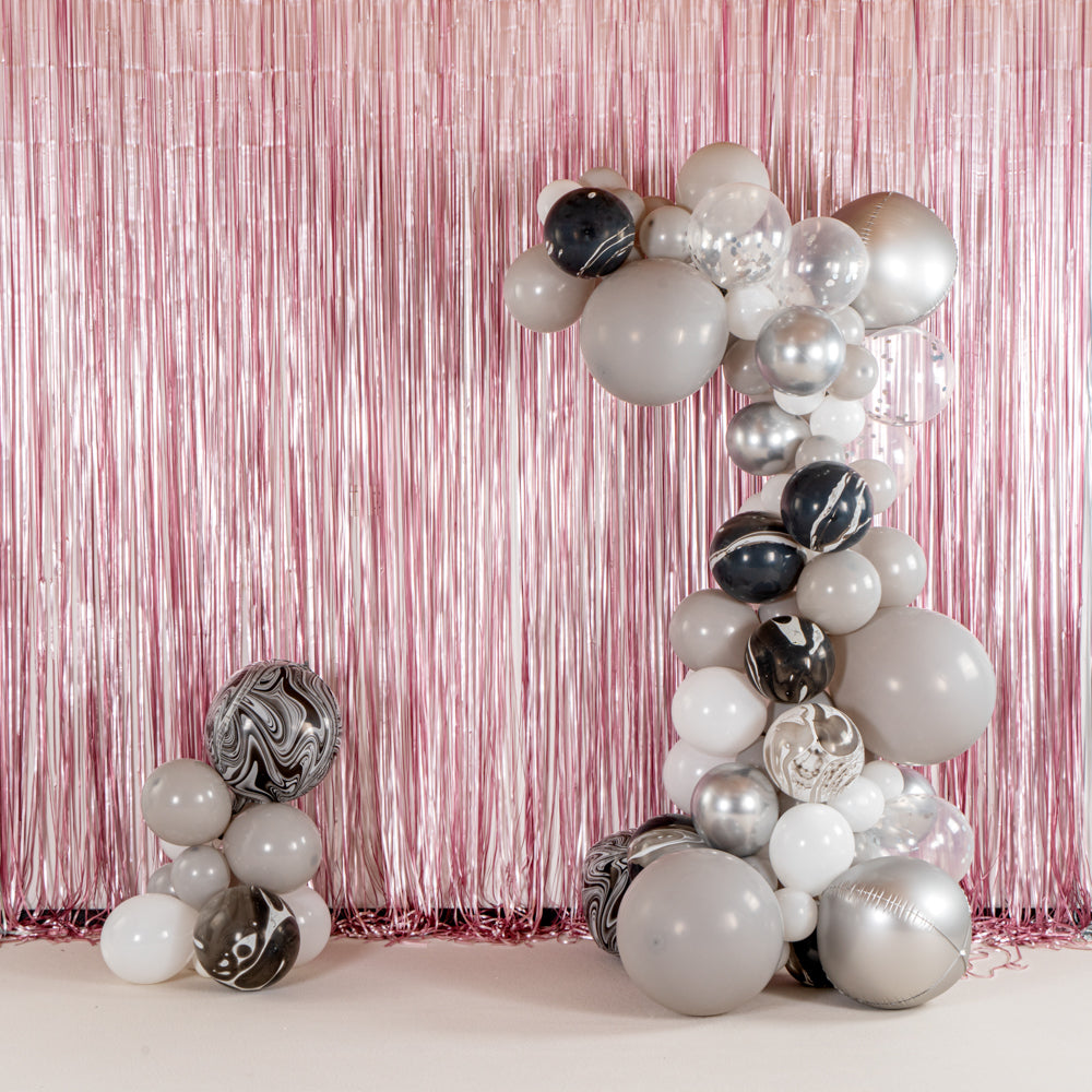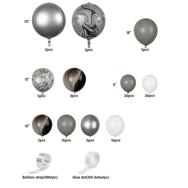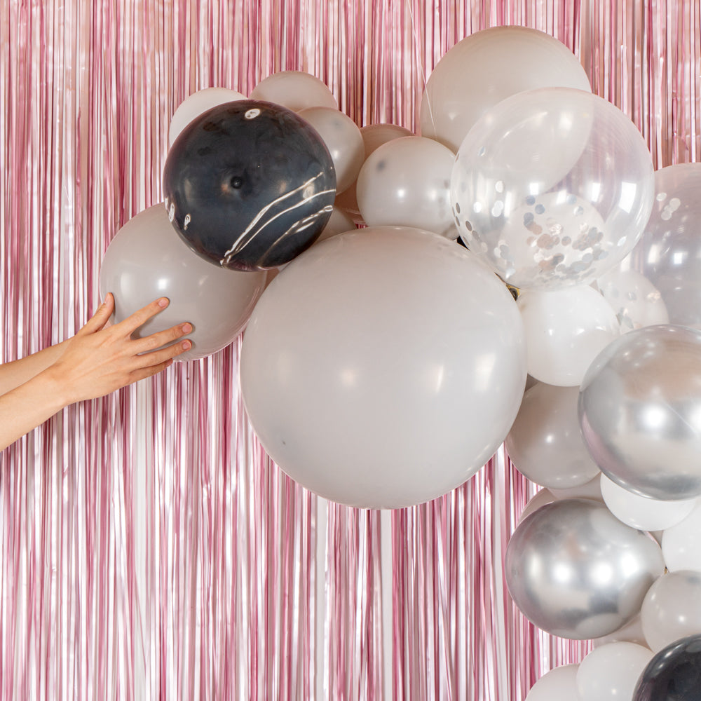 Make dazzling backdrops for your parties with our Balloonify Gray and Metallic Silver Balloon Arch / Garland Kit. This balloon garland arch includes 102 different balloons, 1 balloon strip, and 1 glue dot strip to let you decorate for special events on your own. The latex balloons of this balloon garland backdrop are durable and can stay inflated for 15 days. With 48 matte gray balloons, 30 matte white balloons, 10 agate gray balloons, 5 metallic silver balloons, 5 confetti silver balloons, 2 agate gray balloons (4D), and 2 metallic silver balloons (4D), this balloon garland set allows you to mix and match different colors of balloons. The 4D balloons of this DIY balloon garland kit add a fun element to your decor. Provided with a double-holed balloon strip, this birthday balloon arch kit can securely hold 99 balloons together, giving a professional look to your garland. The nano glue dots of this balloon arch decoration allow you to attach different balloons to the wall, avoiding empty spaces in between. Conveniently set up these balloons outdoors, as the nano dots are moistureproof and protect your balloon clusters. You'll receive 5-inch balloons (50 pieces), 10-inch balloons (37 pieces), 12-inch balloons (8 pieces), 18-inch balloons (3 pieces), 22-inch balloons (4 pieces). 16.4-foot long balloon strip (1 piece), and 1 glue dot strip with 100 dots. All the balloons are shipped flat and deflated. Sold in a box with 48 matte gray balloons, 30 matte white balloons, 10 agate gray balloons, 5 metallic silver balloons, 5 confetti silver balloons, 2 agate gray balloons (4D), and 2 metallic silver balloons (4D), 1 balloon strip, and 1 glue dot. Arch not included. Electric air balloon pump (SKU: RWP1061) is available and sold separately.
