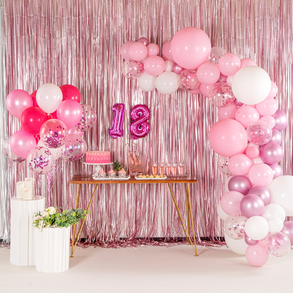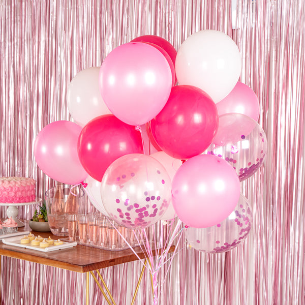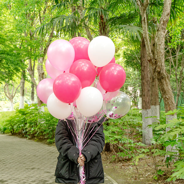 Decorate the confetti balloons and pop it for a quick colorful reveal with our Balloonify Pink Confetti Balloon Set. With 19 balloons and 1 ribbon, this pink confetti balloon set is ideal for gender reveal celebrations, birthday celebrations, weddings, and all kinds of special events. This confetti balloons kit includes 4 matte white balloons, 5 matte dark pink balloons, 5 confetti pink balloons, and 5 metallic pink balloons. Prefilled with confetti, this confetti balloon set can be popped out for a surprise at your event, creating a confetti rain. To make the balloons float, these confetti latex balloons are suitable for helium and air inflation; fill them with a 3:1 ratio of helium and air for long-lasted floating. Easily spread the confetti of these latex balloons using hi-float or brushing woolen cloth over the balloon after it inflated to create static to spread the confetti. This confetti-filled balloon set includes a 32.8-foot ribbon for corralling the balloons together in a decorative way. For creating a cute pink backdrop, this confetti birthday balloon set includes 12-inch balloons (19 pieces) and 32.8-foot long ribbon (1 piece). All the balloons are shipped flat and deflated. Sold in a box with 4 matte white balloons, 5 matte dark pink balloons, 5 confetti pink balloons, 5 metallic pink balloons and 1 ribbon. Electric air balloon pump (SKU: RWP1061) is available and sold separately.