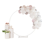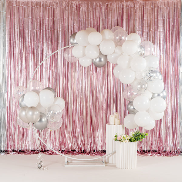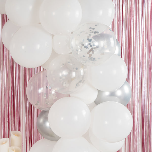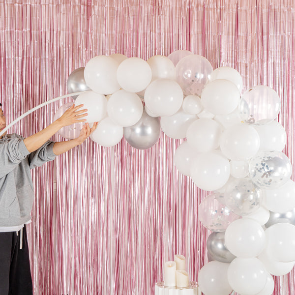 Add colorful decorations to your special occasions with our Balloonify White and Silver Balloon Arch / Garland Kit. The latex balloons of this white and silver arch kit are durable and can be used for both indoor and outdoor events. This balloon arch decoration kit includes 70 balloons, 1 balloon strip, and 1 glue dot strip to set up a garland of your own style. With 50 matte white balloons, 10 metallic silver balloons, and 10 confetti silver balloons, this balloon garland arch kit allows you to create a unique palette of balloons. This balloon arch decoration has confetti balloons to add a shimmering look to your decor. The balloon strip of this balloon garland backdrop set has snowman holes that allow you to insert knotted balloons into the bigger hole and slide it into the smaller one to secure them. Equally gapped, the 16.4-foot balloon chain of this balloon garland arch can effortlessly hold 99 balloons without falling off. The glue dot strip of this balloon garland set has 100 nano glue dot adhesives to attach clusters of balloons to your garland. Plus, they can be conveniently used outdoors as the glue dots are moistureproof. You will receive 12-inch balloons (55 pieces), 5-inch balloons (15 pieces) 16.4-foot long balloon strip (1 piece), and 1 glue dot strip with 100 dots. All the balloons are shipped flat and deflated. Sold in a box with 50 matte white balloons, 10 metallic silver balloons, 10 confetti silver balloons, 1 balloon strip, and 1 glue dot. Arch not included. Electric air balloon pump (SKU: RWP1061) is available and sold separately.