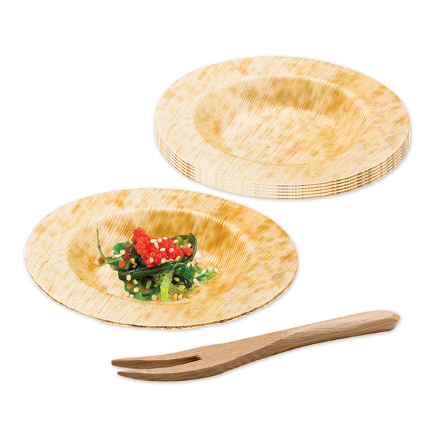 Serve delectable appetizers and hors d'oeuvres with our Bambuddha Round Natural Bamboo Small Plates with Natural Bamboo Mini Forks. Crafted from premium bamboo, these mini plates and forks have a sturdy construction to serve various hot or cold food items. These round plates feature a stylish wood finish that pairs well with various tablescapes, while the single-use tasting forks have two long tines, making assembling and serving bite-sized fare effortless. To minimize the impact of traditional plastic forks and plates, these round bamboo plates and cocktail forks are biodegradable and commercially compostable for an eco-friendly cleanup. With a lightweight, compact design, these disposable bamboo dishes make transporting and storing them convenient for any operator. Featuring a smooth, splinter-free design, these disposable plates and cocktail forks reduce annoying wood chips. These small plates measure 3.5 inches in diameter, and the bamboo fork measures 3.5 inches in length. Each order Includes 100 plates and 100 forks. These items will only degrade outside of the traditional solid waste stream.