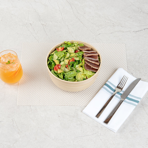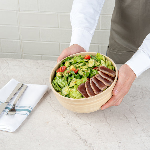 Eliminate messy spills with our greaseproof bamboo salad bowl. The Bambuddha Greaseproof Bamboo Salad Bowl combines a greaseproof design, ideal for handling oily and saucy dishes seamlessly. This bamboo serving bowl, crafted from premium bamboo, supports hot and cold food applications, allowing chefs to diversify their menus effortlessly. Its freezer-safe convenience enables efficient leftover storage, making it perfect for busy kitchens. With a natural color and a 15-ounce capacity, this round bamboo bowl measures 7.87 inches in length and width and 3.94 inches in height, providing ample space for serving. Perfect for eco-conscious establishments, it's biodegradable and commercially compostable, minimizing environmental impact. Enhance your food presentation and operational efficiency by incorporating this versatile bamboo salad bowl into your serviceware collection. Sold in a 1 count box.