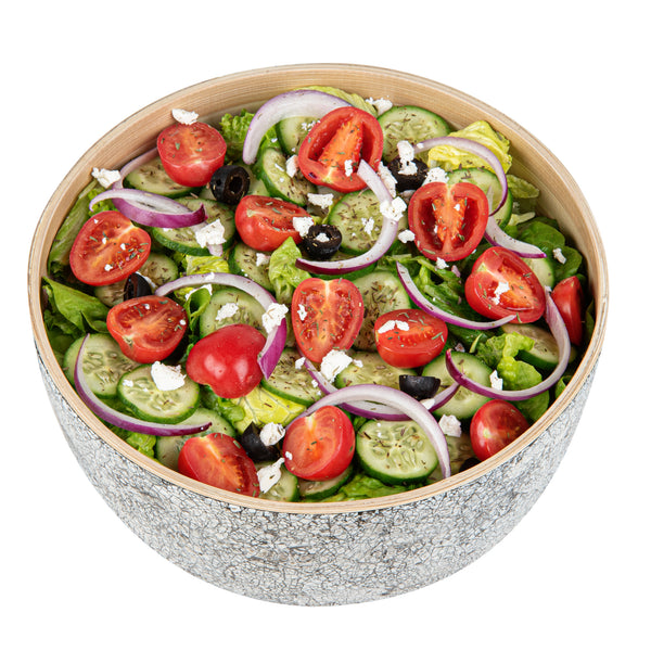 Eliminate messes with the Bambuddha Greaseproof Bamboo Salad Bowl. This bamboo salad bowl features a greaseproof design that allows you to serve a variety of oily and saucy dishes without causing any mess, making it an ideal choice for busy kitchens. Its freezable convenience allows chefs to efficiently store leftover dishes, ensuring that they can easily transition from service to storage. As a bamboo serving bowl, it is suitable for both hot and cold food service, maintaining the integrity of dishes regardless of temperature. With dimensions of 9.45 inches by 9.45 inches and a height of 4.72 inches, this reusable bamboo bowl offers ample space with a capacity of 25.36 ounces, making it perfect for large salads or shared appetizers. The biodegradable and commercially compostable nature of this bowl underscores its commitment to sustainability. Enhance your food presentation and storage with this versatile bamboo bowl. Sold in a 1 count box.