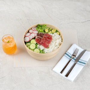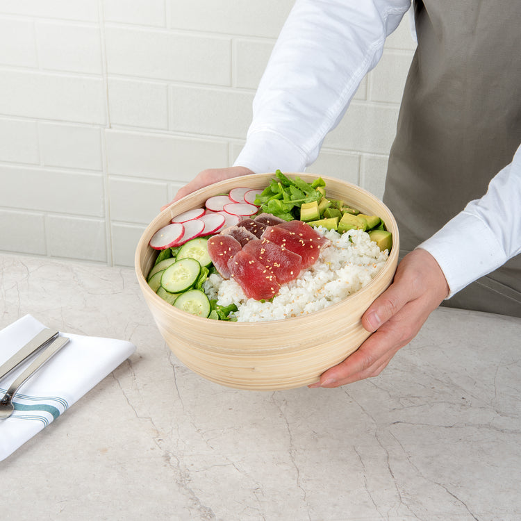 Serve with ease and sustainability using greaseproof bamboo. The Bambuddha Greaseproof Bamboo Salad Bowl offers a mess-free solution for serving oily and saucy dishes, ensuring a clean presentation every time. Crafted from premium bamboo, this bamboo salad bowl is perfect for both hot and cold dishes, providing versatility in various foodservice settings. With its freezer-safe feature, this round bamboo bowl allows effortless storage of leftovers, maintaining freshness without transferring flavors. Sized at 9.45 inches in length, this reusable bamboo dish is designed for robust use, holding up to 25.36 ounces while being biodegradable and commercially compostable. Elevate your foodservice operation with this dependable and eco-friendly solution, perfect for restaurants focusing on sustainable practices. Sold in a 1 count box.
