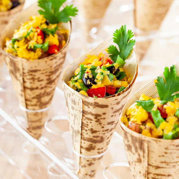 Streamline your plating, presentation, and serving with our Bambuddha stylish 5 Inch Bamboo Food Cones. These versatile bamboo cones provide convenient and sophisticated serving for passed appetizers, snacks, and finger foods at buffets, cocktail parties, and catered events. Bamboo is renowned for being a strong, durable, and nature-friendly resource -- making it the perfect material for manufacturing paper cones for foods. Plus, the beautiful brown and cream hues of our Bambuddha natural bamboo leaf cones perfectly complements a wide range of delectable tapas and treats. Each food cone measures 5 inches and holds 2.5 ounces. Each is shipped in bulk in a 4000 count box.