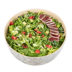 Eliminate mess with greaseproof serving solutions. The Bambuddha Greaseproof Bamboo Salad Bowl is designed with a greaseproof interior, ensuring that oily and saucy dishes stay contained without any spills, making it an ideal bamboo salad bowl for busy kitchens. Crafted from premium bamboo, this large serving bowl is perfect for both hot and cold food, allowing chefs to diversify their menu options with ease. Measuring 13.39 inches in length and width, and 6.3 inches in height, it provides ample space for serving large portions, while its biodegradable and commercially compostable nature aligns with sustainable practices. Additionally, its freezable convenience means you can efficiently store leftovers, saving both time and resources. Embrace functionality and style in your foodservice operations with this handmade bamboo bowl. Sold in a 1 count box.