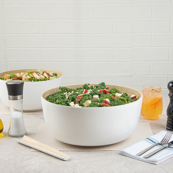 Say goodbye to messy presentations with greaseproof serving ware. The Bambuddha Greaseproof Bamboo Salad Bowl ensures a clean experience when serving oily or saucy dishes, making it an essential bamboo salad bowl for your foodservice establishment. Its biodegradable and commercially compostable bamboo construction provides an eco-friendly option that maintains its integrity with both hot and cold foods, enhancing its versatility as a 13-inch bamboo bowl for any type of cuisine. For added convenience, this reusable salad bowl is freezer-safe, allowing you to effortlessly store leftovers without transferring them to separate containers. With dimensions of 13.39 inches in length and width, and 6.3 inches in height, this white bowl offers a generous capacity of 50.72 ounces, perfect for accommodating large salads or entrees. Maximize your kitchen's efficiency with this multi-functional bamboo salad bowl. Each order includes 1 Bambuddha Greaseproof Bamboo Salad Bowl.