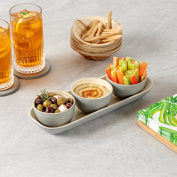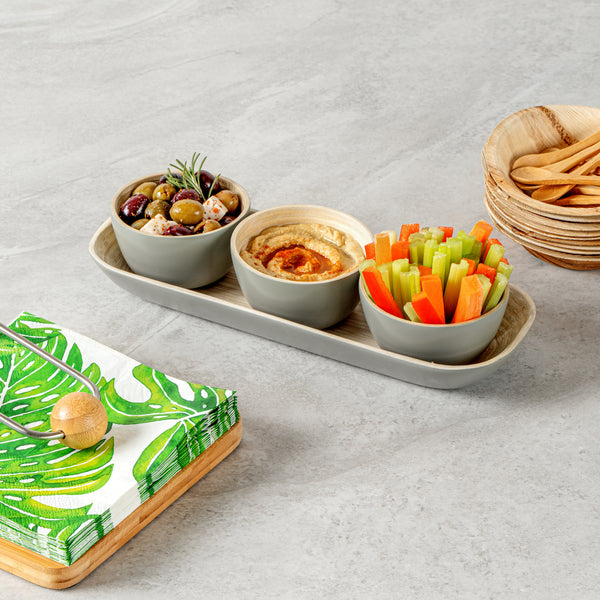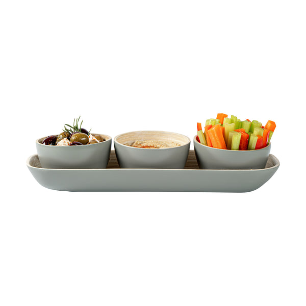 GRAY BAMBOO BOWL SET - 3 BOWLS, BAMBOO TRAY