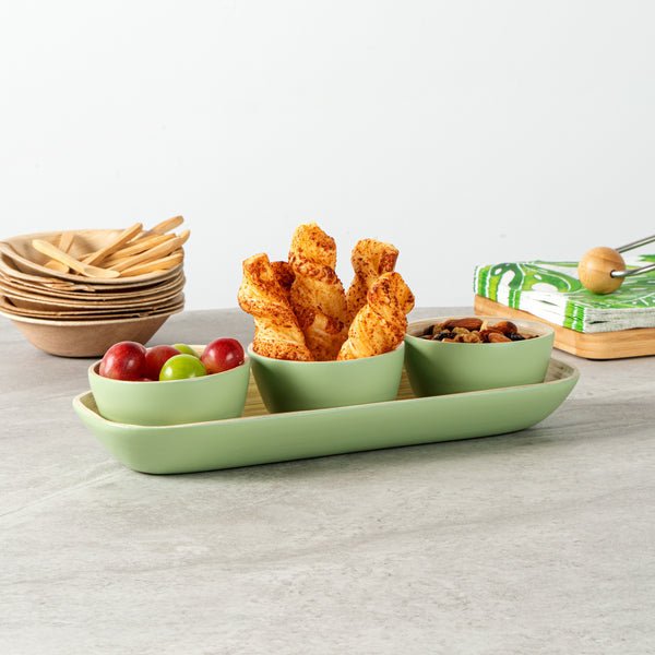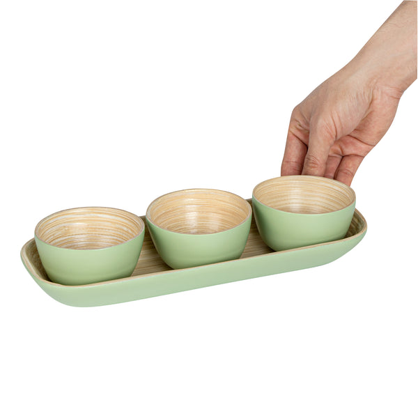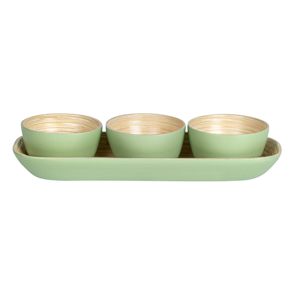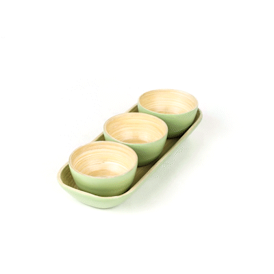 GREEN BAMBOO BOWL SET - 3 BOWLS, BAMBOO TRAY