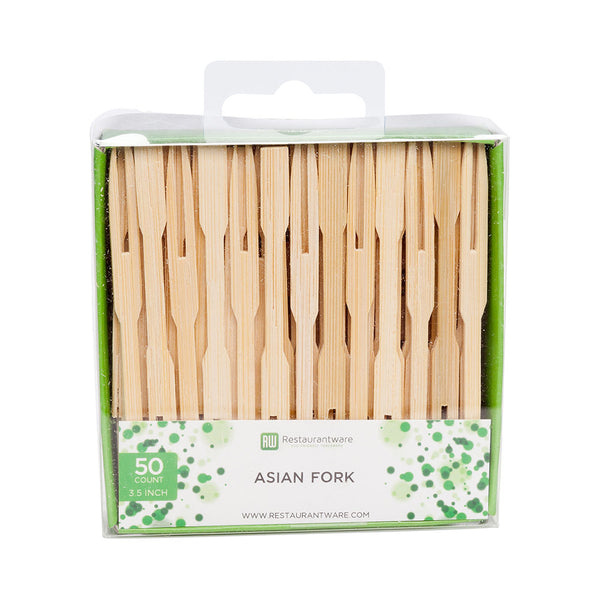 Stylishly serve tasty finger foods and mouth-watering miniature desserts with our Bambuddha Natural Bamboo Asian Forks. The double-pronged design of these small bamboo forks effortlessly pierces and holds your delicious morsels in place. With flattened handles, these single-use forks provide an easy-to-hold and mess-free way for guests to pick up food. Naturally durable and heat-resistant, these bamboo appetizer forks are suitable for hot and cold foods. These disposable bamboo forks streamline the cleaning process. Made with natural bamboo, these mini forks are commercially compostable to reduce your carbon footprint. Measuring 3.5 inches long, these tasting forks are the perfect size for skewering small treats and bite-sized appetizers. These miniature forks are packed in 10 separate boxes, holding 50 forks each. Sold in a 500 count box.