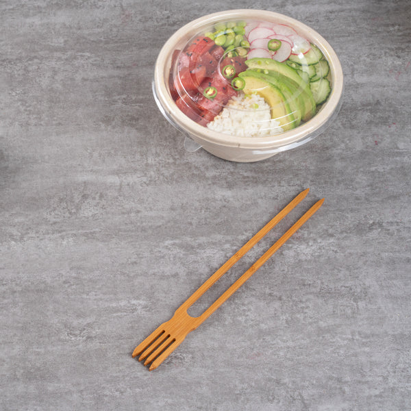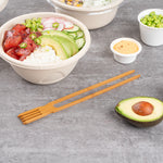 Delicately grab pieces of spicy tuna tataki or scoop up ramen with our Bambuddha Natural Bamboo Chop Fork Duo Utensils. Made from natural bamboo, these chopstick utensils are strong, food-safe, and heat-resistant. The unique connected design of these biodegradable chopstick forks ensures they're comfortable to hold and easy to use with your contemporary Asian fusion fare. These fork chopsticks are disposable for convenient cleaning. With a commercially compostable design, these bamboo fork chopsticks are eco-friendly to use in busy food establishments. Ideal for food trucks, the two-in-one design of these forks with chopsticks makes them a perfect go-to utensil for food trucks, restaurants, or catering companies. Each of these multi-functional chopstick fork utensils measures 10 inches long. Shipped in a 100 count box.