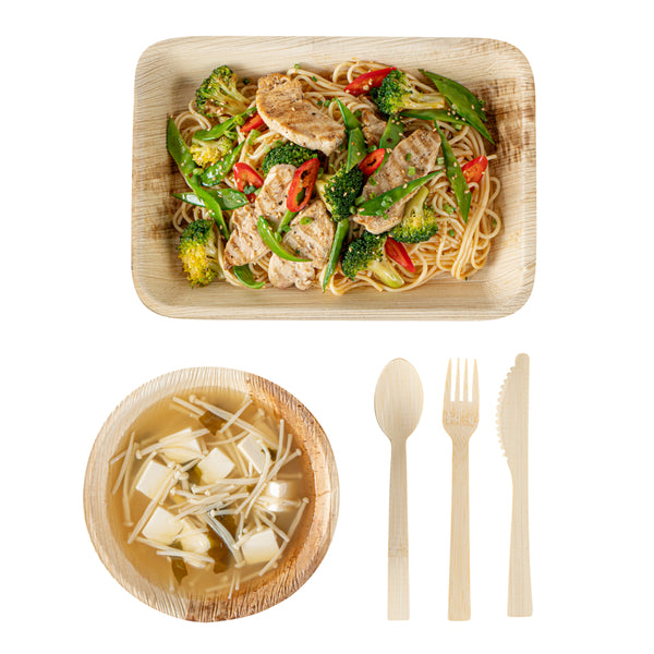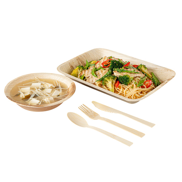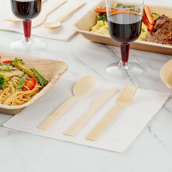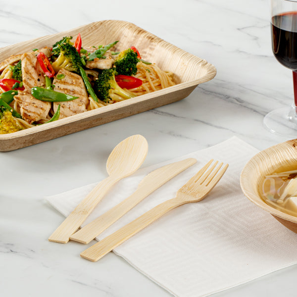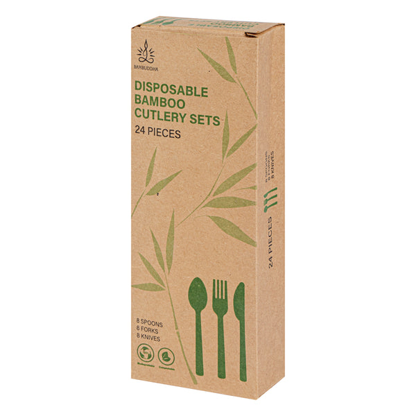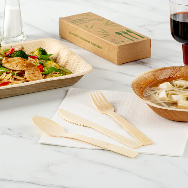Provide guests everything they need to consume their meal with our Bambuddha Natural Bamboo Disposable Cutlery Set. Great for events with friends and family, this cutlery set comes with a fork, spoon, and knife for enjoying many dishes with ease. Made from sustainable bamboo, this bamboo cutlery set is an amazing way to promote environmental practices. Plus, these bamboo utensils are reliably biodegradable and commercially compostable without spreading harm to the planet. Perfect for eating all kinds of meals, this bamboo cutlery set withstands heat and won't warp. For comfortable eating, this biodegradable cutlery combo is splinter-free. This bamboo ware has a wood grain design to provide a rustic look to themed parties, picnics, or your food service establishment. This bamboo cutlery set measures 7 inches in length. Sold in a 24 count box. This item will only degrade outside of the traditional solid waste stream.
