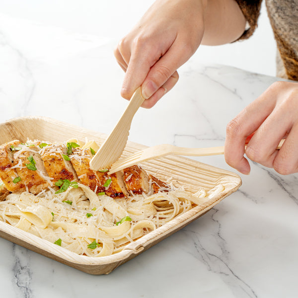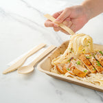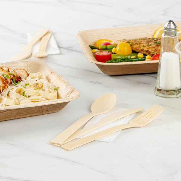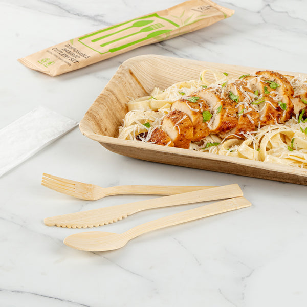 Give your place settings a new look with our Bambuddha Natural Bamboo Disposable Cutlery Sets. To effortlessly enjoy multiple dishes, these disposable utensil sets include a fork, spoon, knife, and white napkin conveniently packaged in kraft paper pouches to ensure cutlery stays clean. Crafted from sustainable bamboo, these travel cutlery sets are commercially compostable and biodegradable to minimize waste on the planet. The heat-resistant design of these bamboo utensils ensure that they won't warp due to the temperatures of hot meals. Featuring a smooth surface, these bamboo flatware sets help you avoid getting splinters while handling them. With a wood grain finish, these disposable bamboo utensils complement your theme or event's aesthetic. These disposable cutlery sets have a fork, spoon, and knife that measure 7 inches long. Sold in a 100 count box. This item will only degrade outside of the traditional solid waste stream.