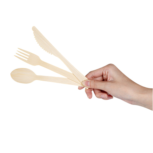 Give your place settings a new look with our Bambuddha Natural Bamboo Disposable Cutlery Sets. To effortlessly enjoy multiple dishes, these disposable utensil sets include a fork, spoon, knife, and white napkin conveniently packaged in kraft paper pouches to ensure cutlery stays clean. Crafted from sustainable bamboo, these travel cutlery sets are commercially compostable and biodegradable to minimize waste on the planet. The heat-resistant design of these bamboo utensils ensure that they won't warp due to the temperatures of hot meals. Featuring a smooth surface, these bamboo flatware sets help you avoid getting splinter while handling them. With a wood grain finish, these disposable bamboo utensils complement your theme or event's aesthetic. These disposable cutlery sets have a fork, spoon, and knife that measure 7 inches long. Sold in a 500 count box. This item will only degrade outside of the traditional solid waste stream.