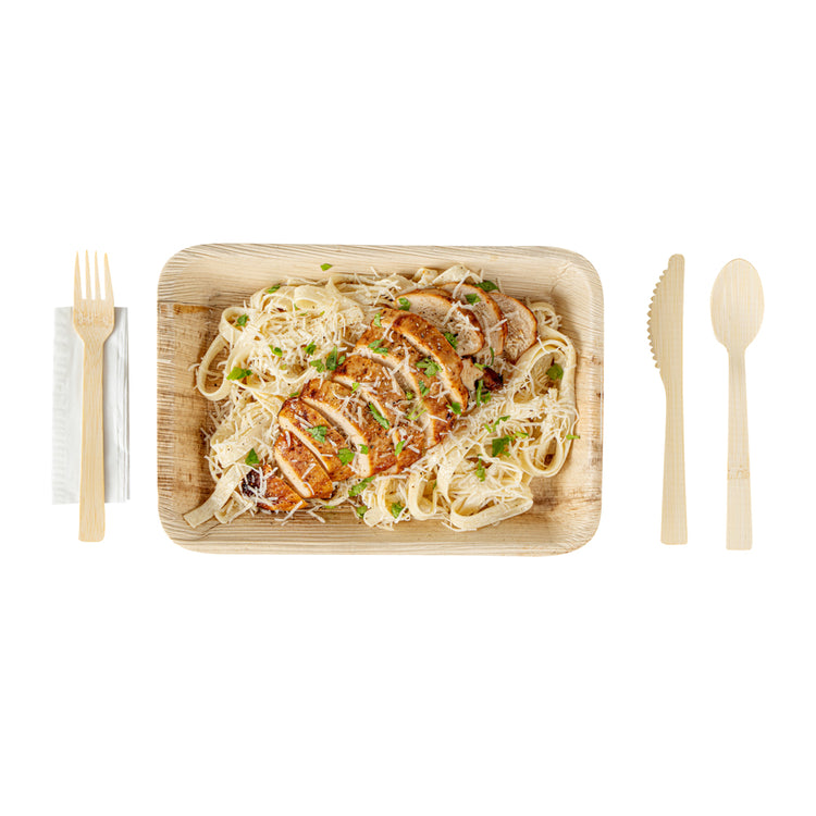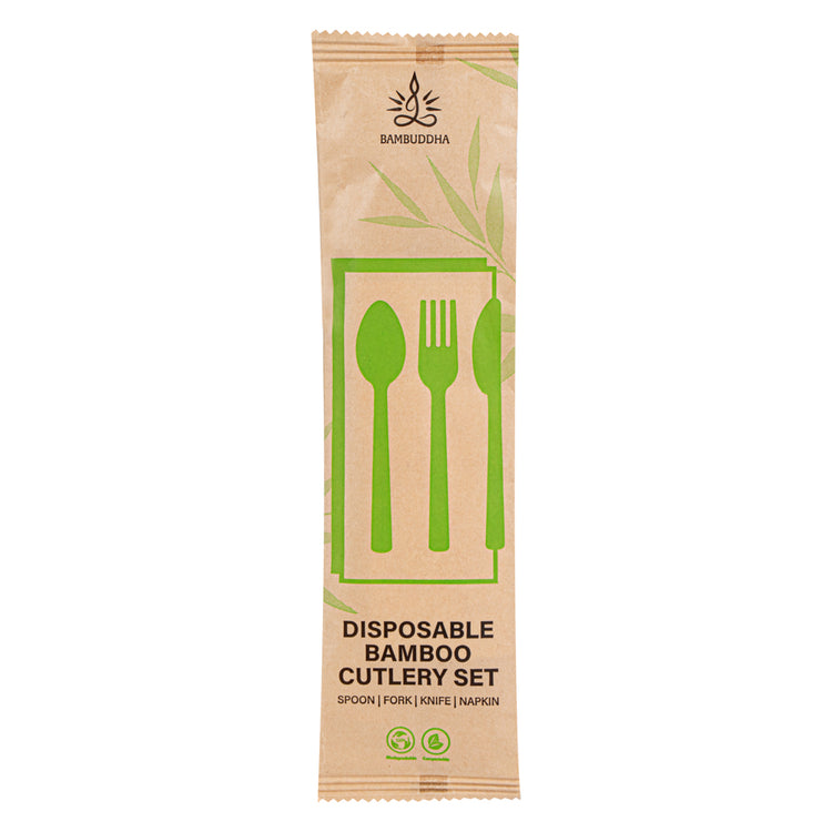Give your place settings a new look with our Bambuddha Natural Bamboo Disposable Cutlery Sets. To effortlessly enjoy multiple dishes, these disposable utensil sets include a fork, spoon, knife, and white napkin conveniently packaged in kraft paper pouches to ensure cutlery stays clean. Crafted from sustainable bamboo, these travel cutlery sets are commercially compostable and biodegradable to minimize waste on the planet. The heat-resistant design of these bamboo utensils ensure that they won't warp due to the temperatures of hot meals. Featuring a smooth surface, these bamboo flatware sets help you avoid getting splinter while handling them. With a wood grain finish, these disposable bamboo utensils complement your theme or event's aesthetic. These disposable cutlery sets have a fork, spoon, and knife that measure 7 inches long. Sold in a 500 count box. This item will only degrade outside of the traditional solid waste stream.