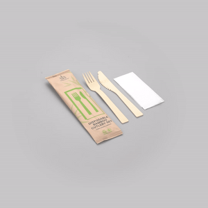 NATURAL BAMBOO DISPOSABLE FORK / KNIFE SET - WHITE NAPKIN, KRAFT POUCH