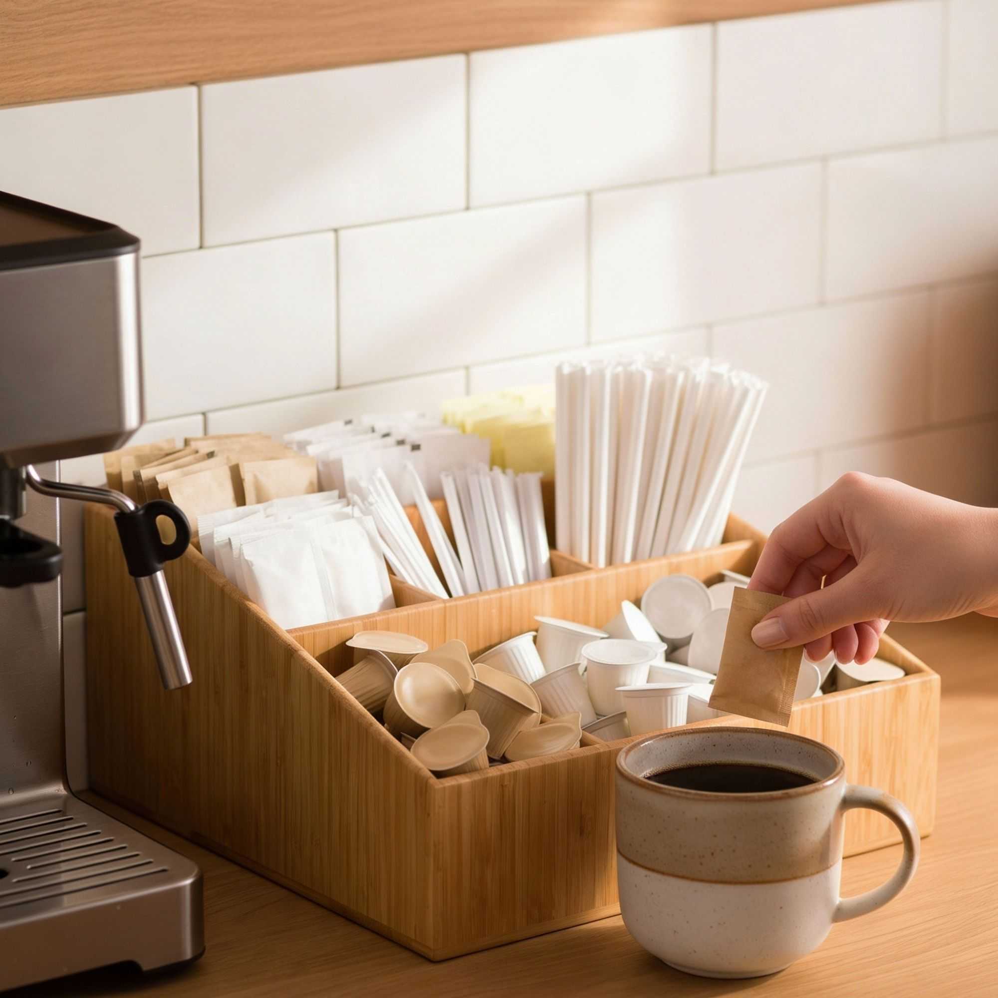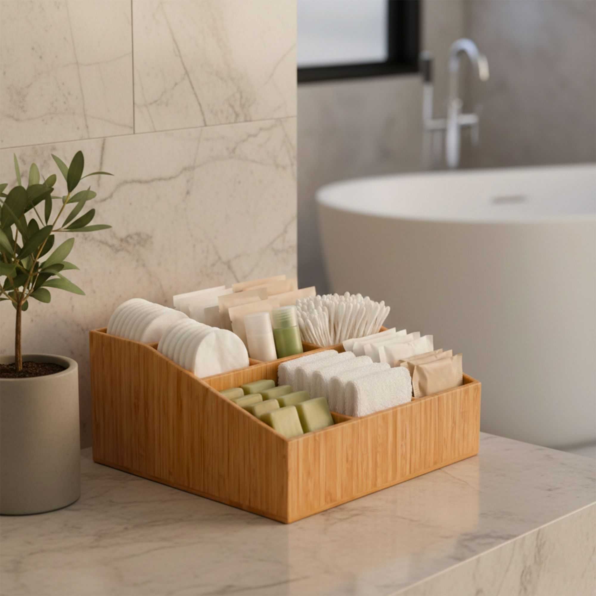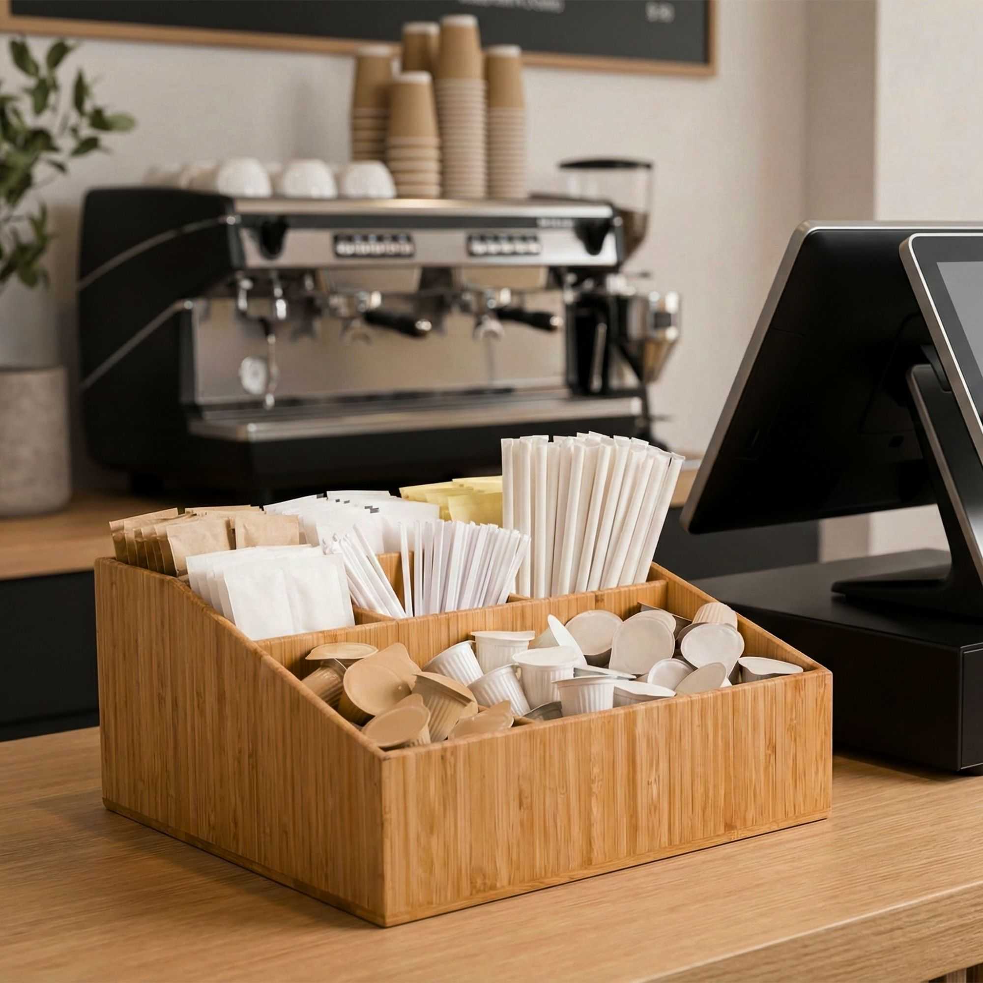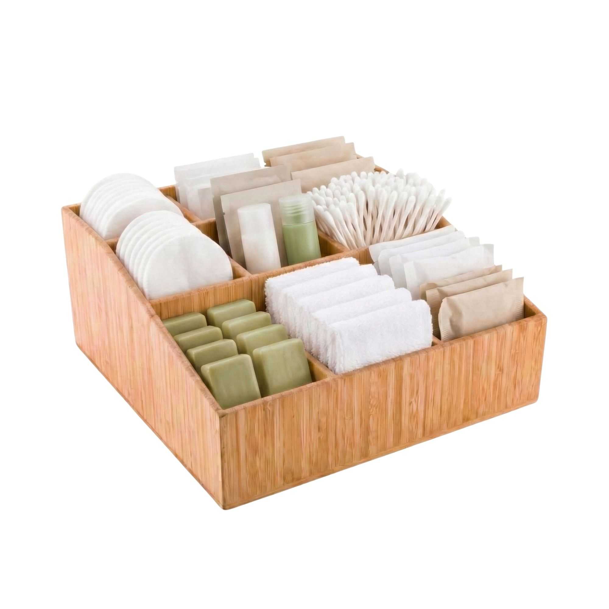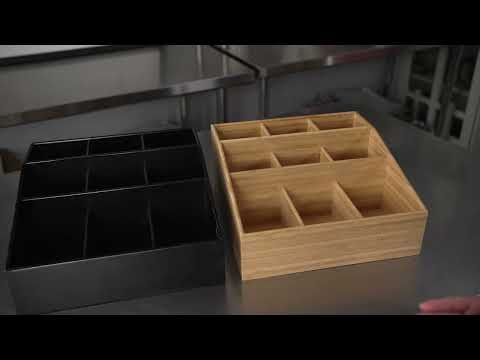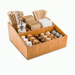 Our Bambuddha Square Natural Bamboo Condiment Organizer ensures that condiments in your beverage stations are clean and tidy. Crafted from all-natural bamboo, this nature-friendly condiment holder is chip-resistant, durable, and built to last. With a natural bamboo finish, this chic condiment organizer adds a natural look to your cafe, catered event, or breakfast buffet. With 9 total compartments, this eco-friendly packet organizer allows you to place all your condiments in one area. Measuring 11.75 inches long by 11.75 inches wide, this versatile condiment organizer gives you the ability to store sugar packets and creamers at your coffee shop or flatware and sauces at your fast-casual restaurant. The 3 bottom compartments measure 4.75 inches long by 3.5 inches wide. Each of the 3 middle compartments measures 3.4 inches long by 2.6 inches and the top compartments measure 2.75 inches long by 2.6 inches wide. Available in a 1 count box.