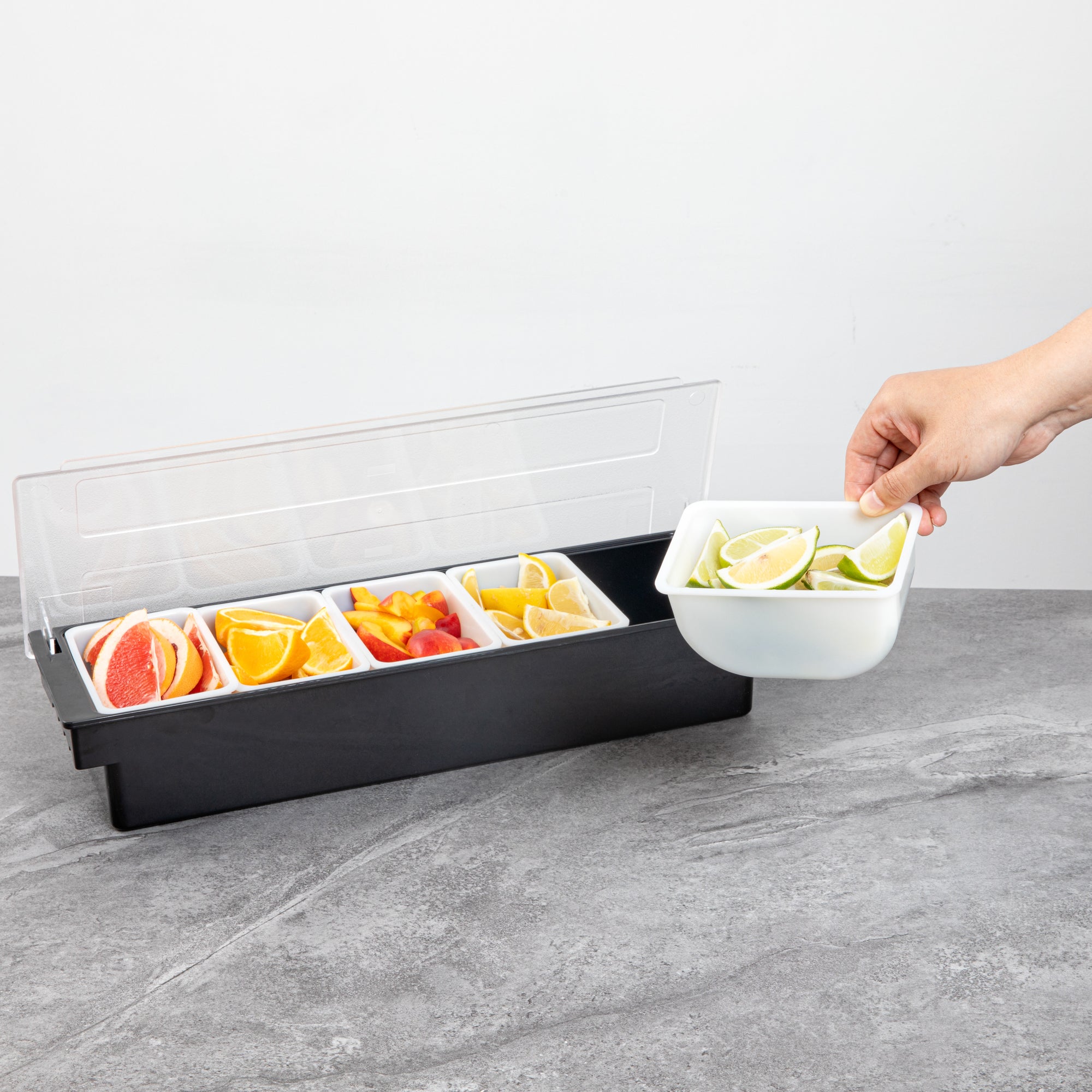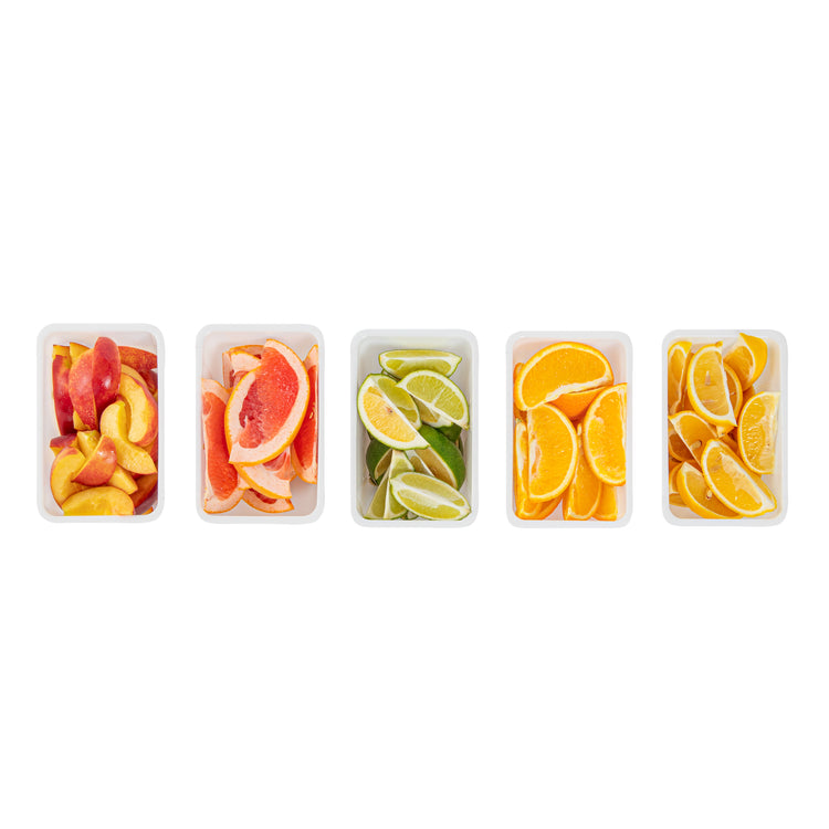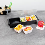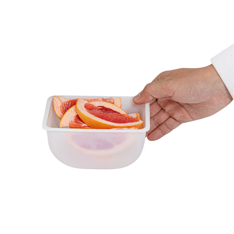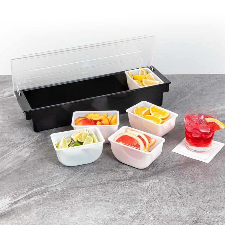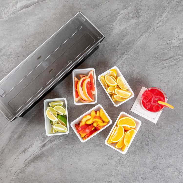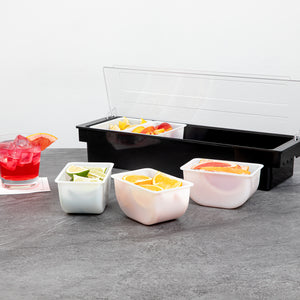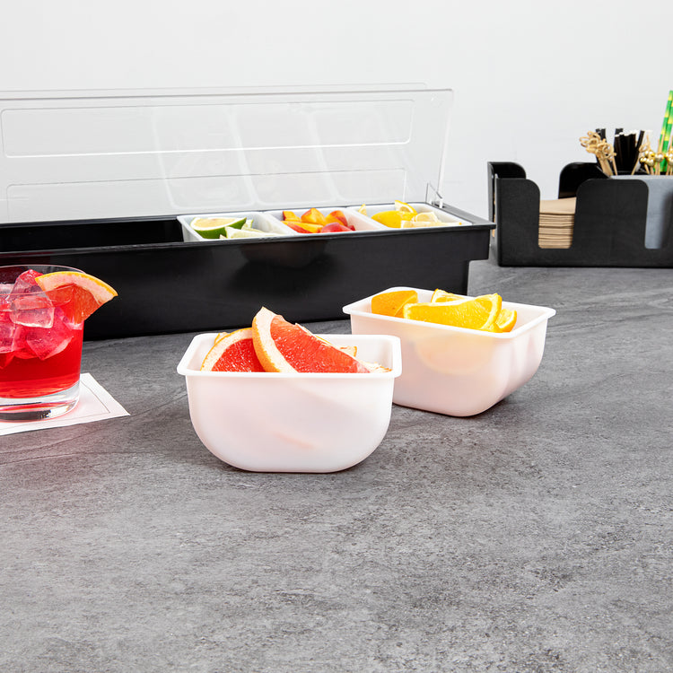 Keep your condiments neatly organized with our Bar Lux 1.25-pint White Plastic Insert. Pair this plastic container with its compatible condiment caddy (SKU: RWT0488) to keep your garnishes or condiments neatly organized and accessible. Featuring a flat bottom design, this condiment container is supremely stable and keeps your garnishes intact. Great for holding cocktail garnishes behind the bar, this versatile condiment holder makes mixed drink preparation a breeze. Fill this caddy insert with freshly sliced fruit and place them at the front of your buffet for quick self-service. Made from durable plastic, this garnish holder withstands the wear and tear of everyday use, ensuring extended service. Plus, this white plastic container is easy to wipe down, helping you maintain cleanliness standards in your establishment. With a capacity of 1.25 pints, this garnish holder for bar measures 5.5 inches in length by 3.5 inches in width by 2.75 inches in height. Sold in a 1 count box. Condiment caddy is available and sold separately.