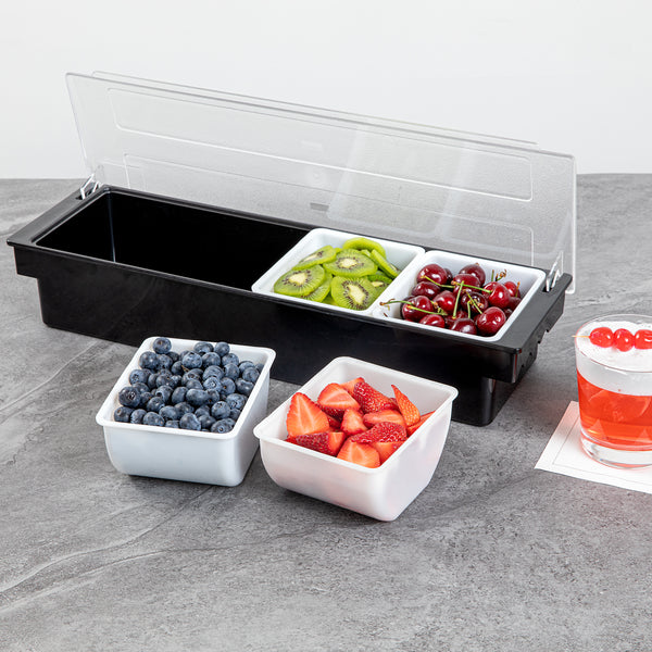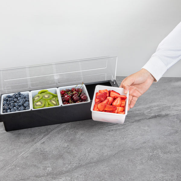 Elevate your foodservice organization with our Bar Lux 1.5-pint White Plastic Insert. Pair this condiment holder with its compatible caddy (SKU: RWT0487) to keep your condiments neatly organized and easily accessible. Featuring a flat bottom design, this garnish holder is stable and keeps your garnishes intact. The versatile design of this garnish holder for bar is great for holding cocktail garnishes behind the bar for easy retrieval when making mixed drinks. Fill this plastic container with freshly sliced fruit and place them at the front of your buffet for quick self-service. Made from durable plastic, this caddy insert is built to withstand the wear and tear of everyday use, ensuring extended service for your business. This white plastic container is easy to wipe down as well, helping you maintain cleanliness standards in your establishment. With a capacity of 1.5 pints, this condiment container measures 4.5 inches in length by 5.5 inches in width by 2.75 inches in height. Sold in a 1 count box. Condiment caddy is available and sold separately.