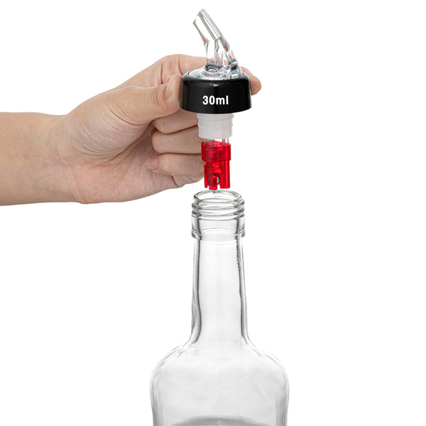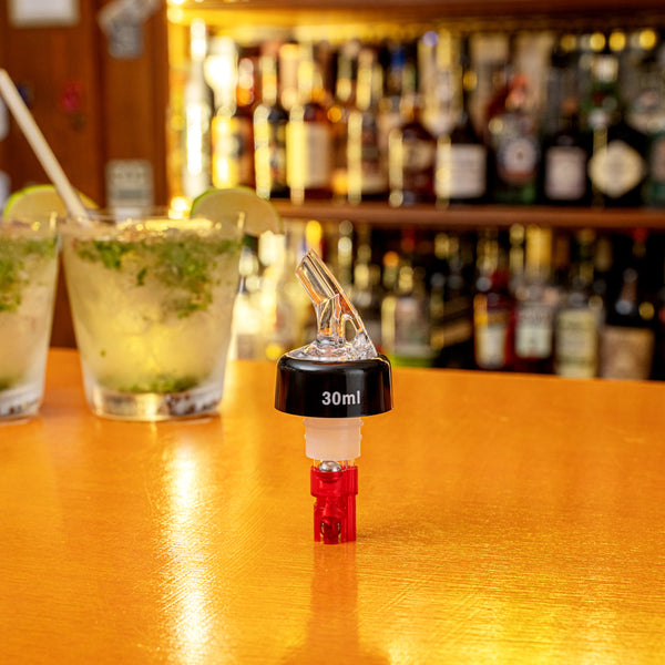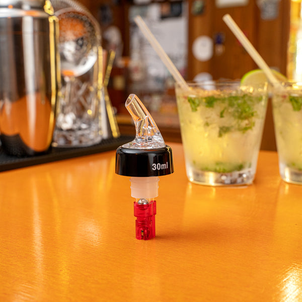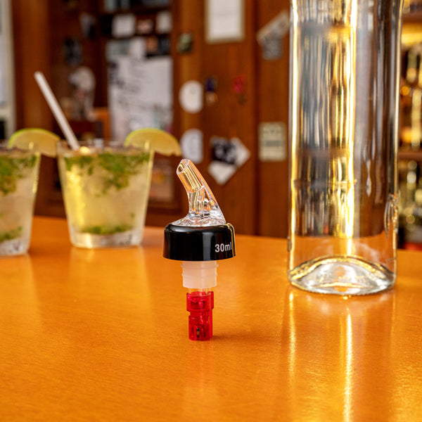 Easily pour shots of whiskey, rum, or tequila using our Bar Lux 1-ounce Red Plastic Measured Liquor Pourers. These whiskey pourers are designed with a tight-fitting black collar to prevent messes while serving. The clear spout of these measured liquor pourers provides expert visibility when pouring drinks. Perfect for serving shots or up to 1 ounce of your desired liquor, these whiskey pourers are designed to accurately and easily measure portions of alcohol as you serve customers. These measured liquor pourers include ball bearings on the inside to help you pour beverages in a spill-free manner and reduce waste. Made with a bright red tail, these shot measure pourers are ideal for quickly identifying different liquors or spout sizes at your restaurant, bar, or hotel. Made with premium crack-resistant plastic, these shot measure pourers can withstand daily use at your bar while maintaining its appearance. These whiskey pourers measure 1.38 inches in diameter by 3.74 inches in height. Shipped in a 50 count box.