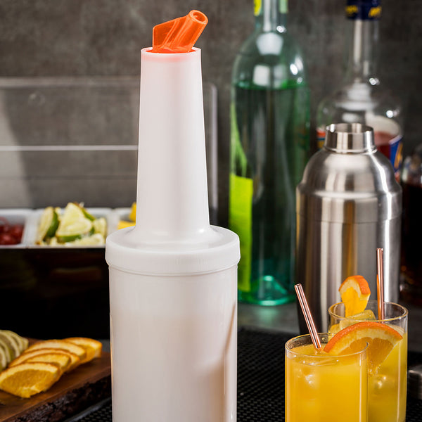 Upgrade your cocktail preparations with this Bar Lux Quick Pour Storage Container Bottle. Equipped with an interchangeable dispensing lid and twist-on storage lid, this quick pour storage bottle is ideal for storing and pouring juices, syrups, mixes, sauces, and more! The dispensing lid is designed with an extended, easy-to-grip neck that provides a secure grip for fast and precise pouring, while the twist-on storage lid provides an airtight seal for maximum freshness. Equipped with a color-coded pour spout and twist-on lid, the bright orange accents on this juice storage bottle make it simple for staff to stay prepared and organized throughout their shift. Each of these 1-quart plastic containers with lids is manufactured from premium plastic and is designed to withstand long-term commercial use. Ideal for use as a salad bar dressing container or a juice storage container, this 1-qt quick pour bottle is sold in a 1 count box.